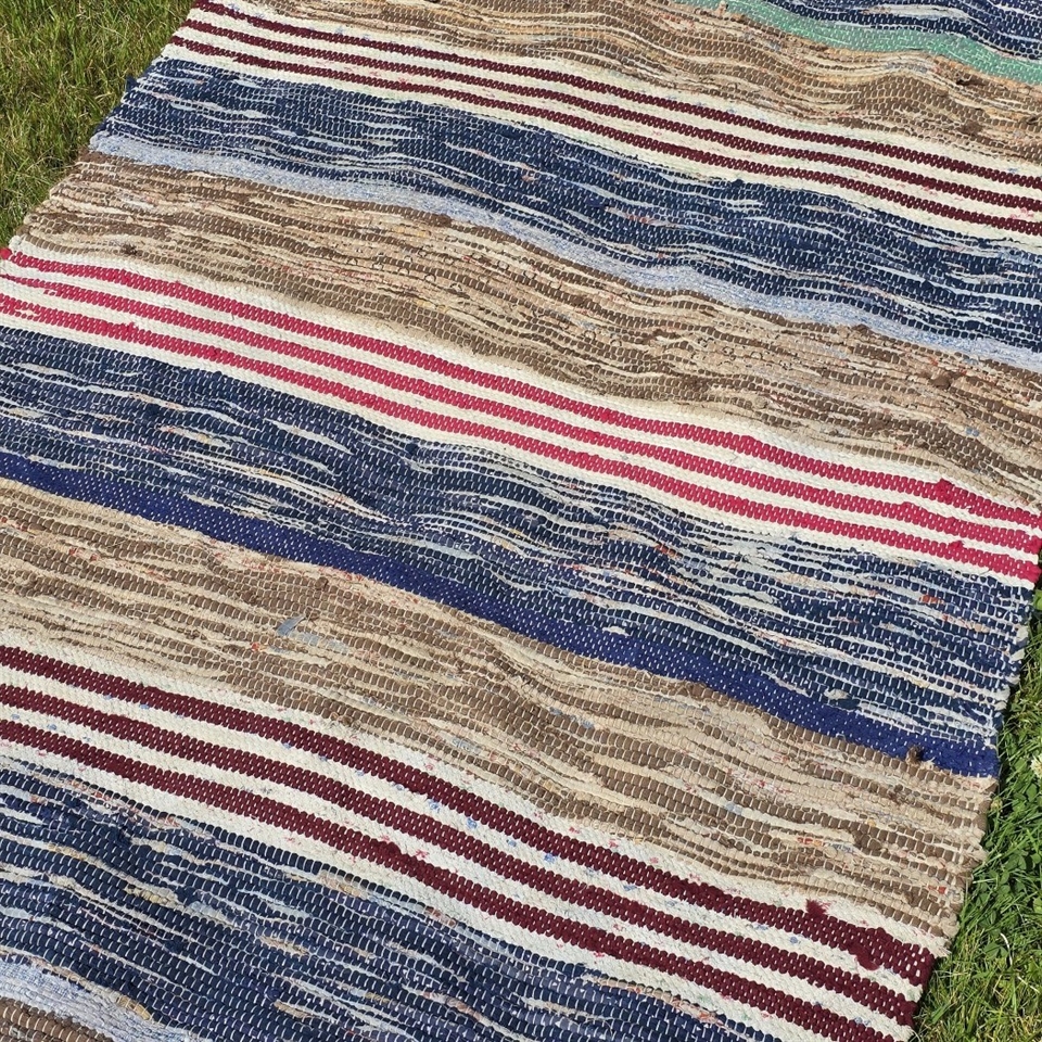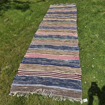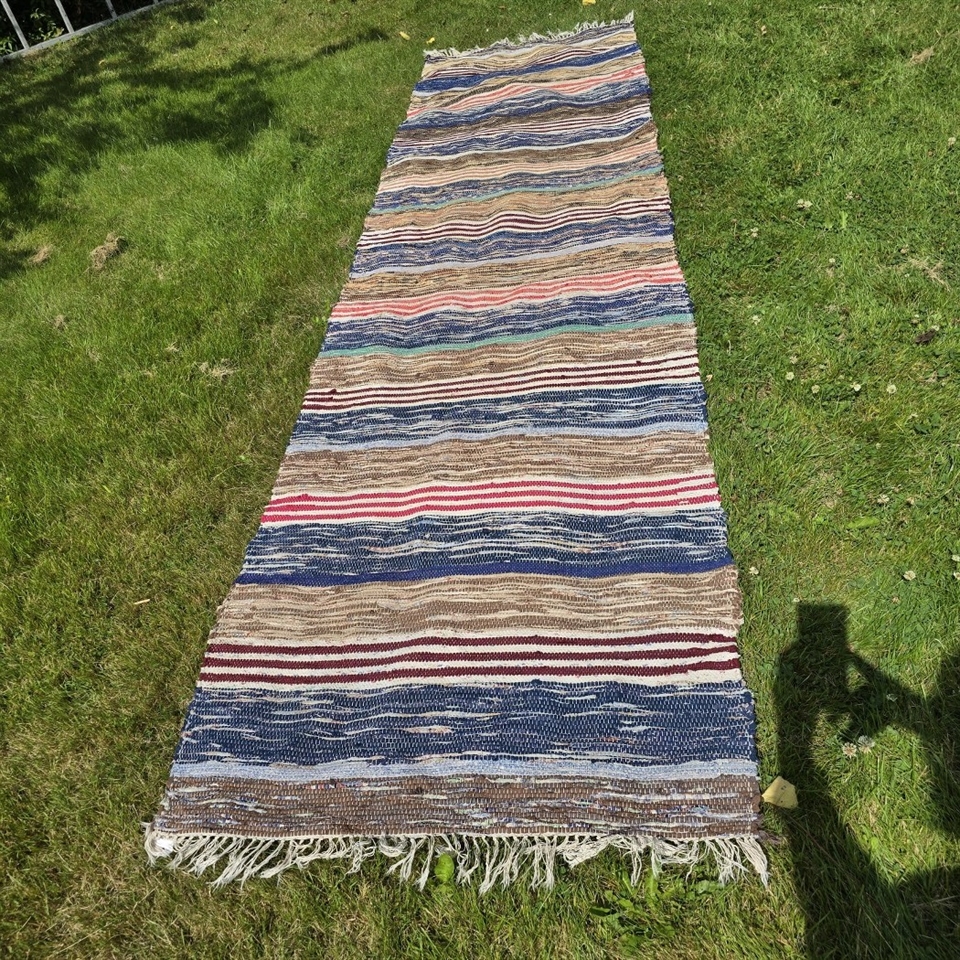 Perfekt til enhver, der værdsætter håndværk og historie, og som ønsker at tilføre deres indretning en unik og personlig touch. Gør dit hjem mere indbydende med vores 'Lang stribet gammel løber fra Sverige, kludetæppe' – et ægte mesterværk af farver og fortællinger!