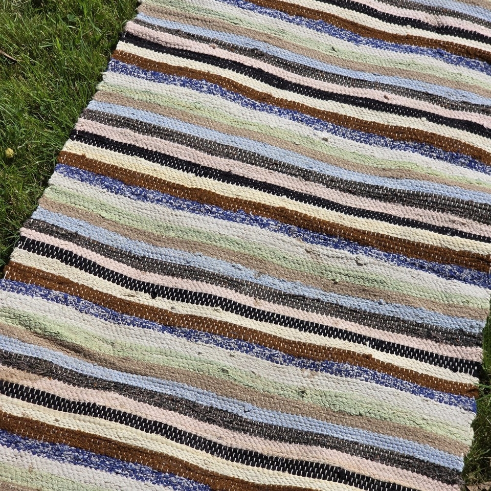 Håndvævet med kærlighed og omhu i Sverige, kombinerer denne 'trasmatta' klassiske striber i blå, beige og brune toner, hvilket skaber en tidløs æstetik, der passer perfekt ind i både moderne og traditionelle indretninger.
