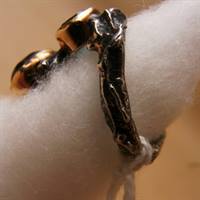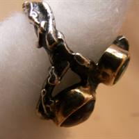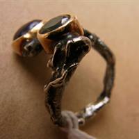 Forrygende ring i sølv og guldfarvet materiale, en fazetslebet grøn sten og en lilla naturperle er sat i ringen.