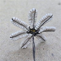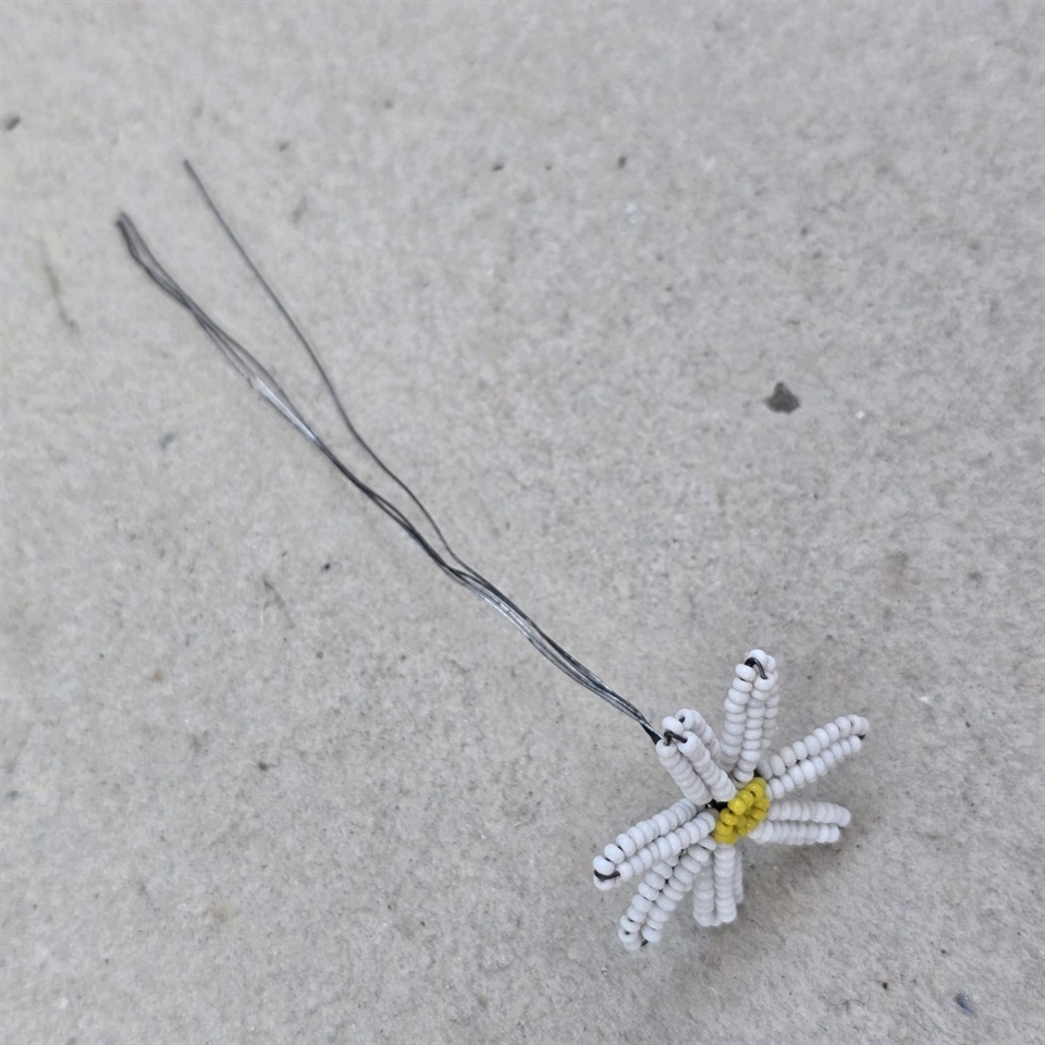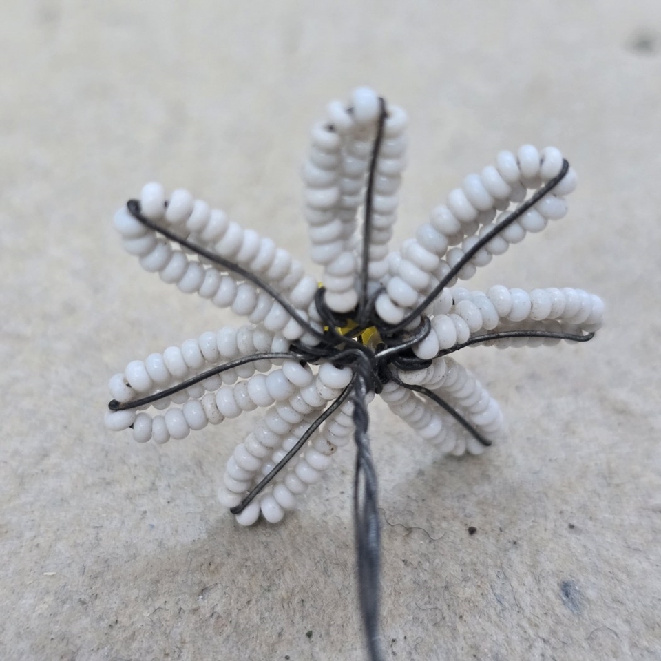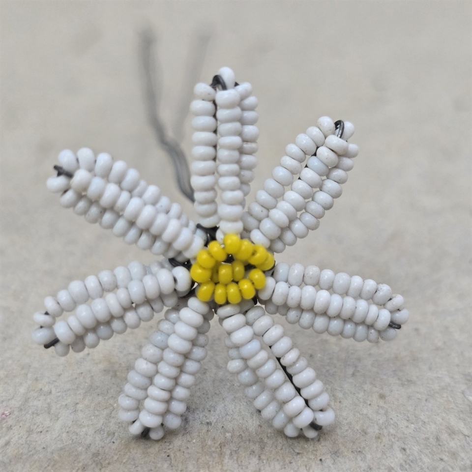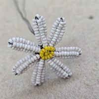 Denne fine håndarbejdede blomst er omhyggeligt sammensat af hvide glasperler med en indbydende gul midte, der fanger øjet og bringer et smil frem.
