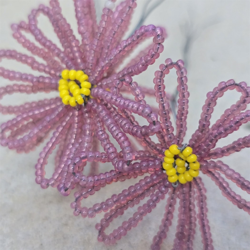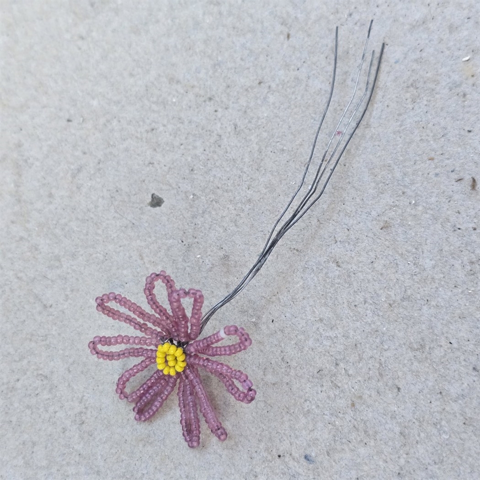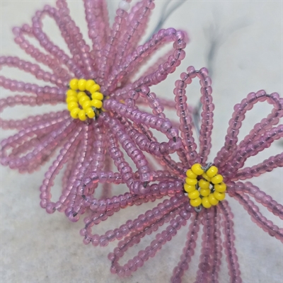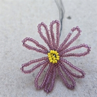 Denne perleblomst er sammensat af fine glasperler, arrangeret i flere lag for at skabe en dybde og tekstur, der fanger øjet. Med sin livlige lilla farve og indbydende gule midte, er denne blomst ikke bare en dekoration, men et lille kunstværk, der kan fremkalde en følelse af nostalgi og raffinement.