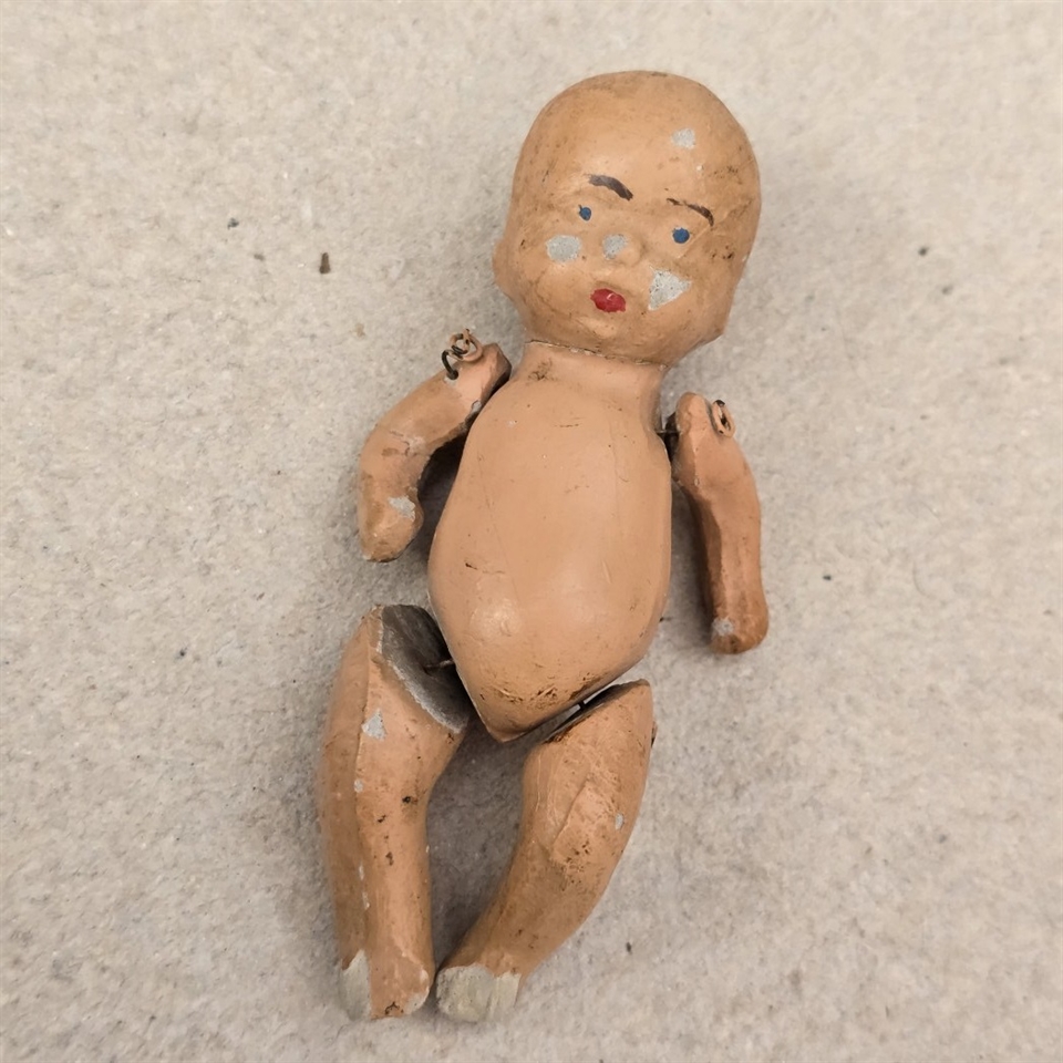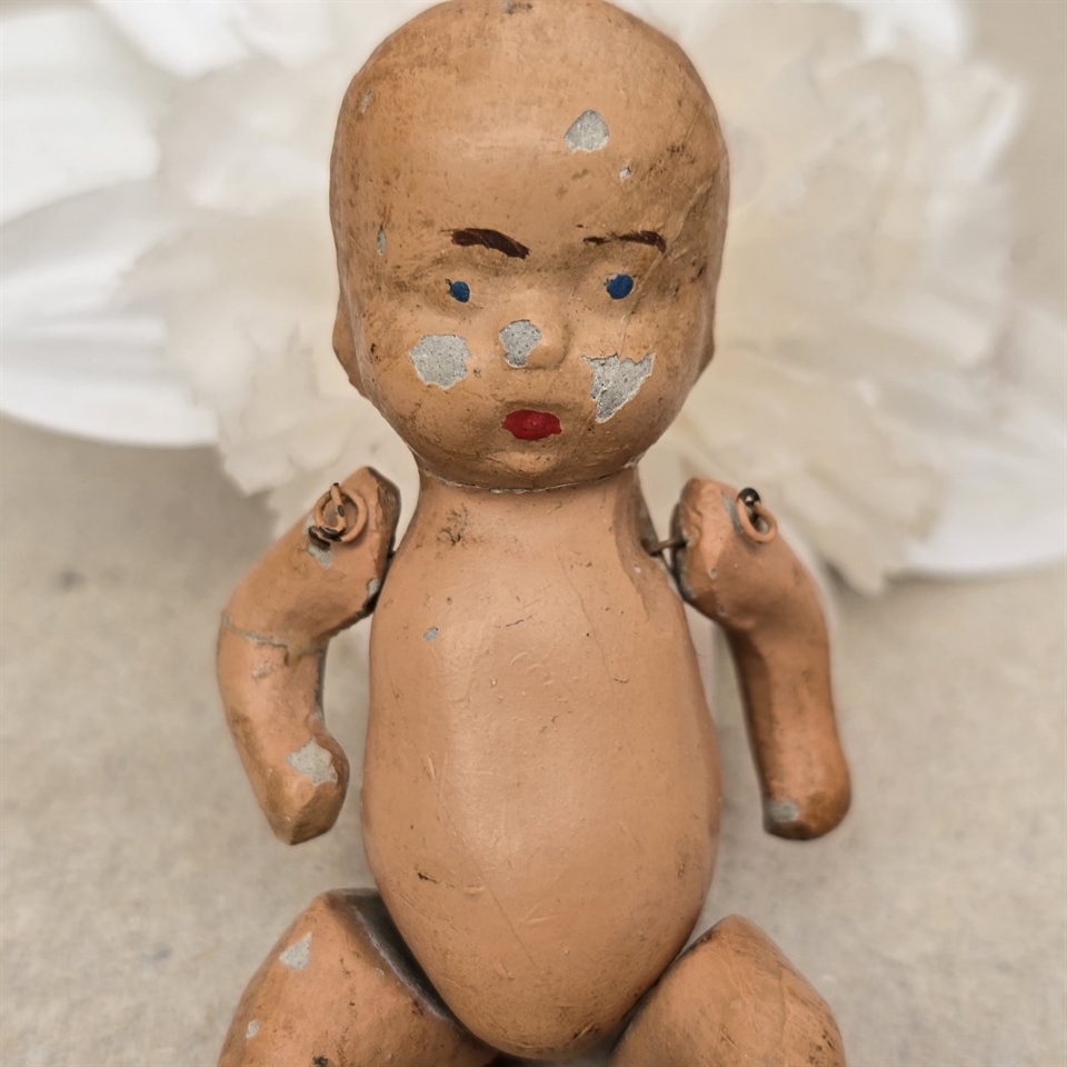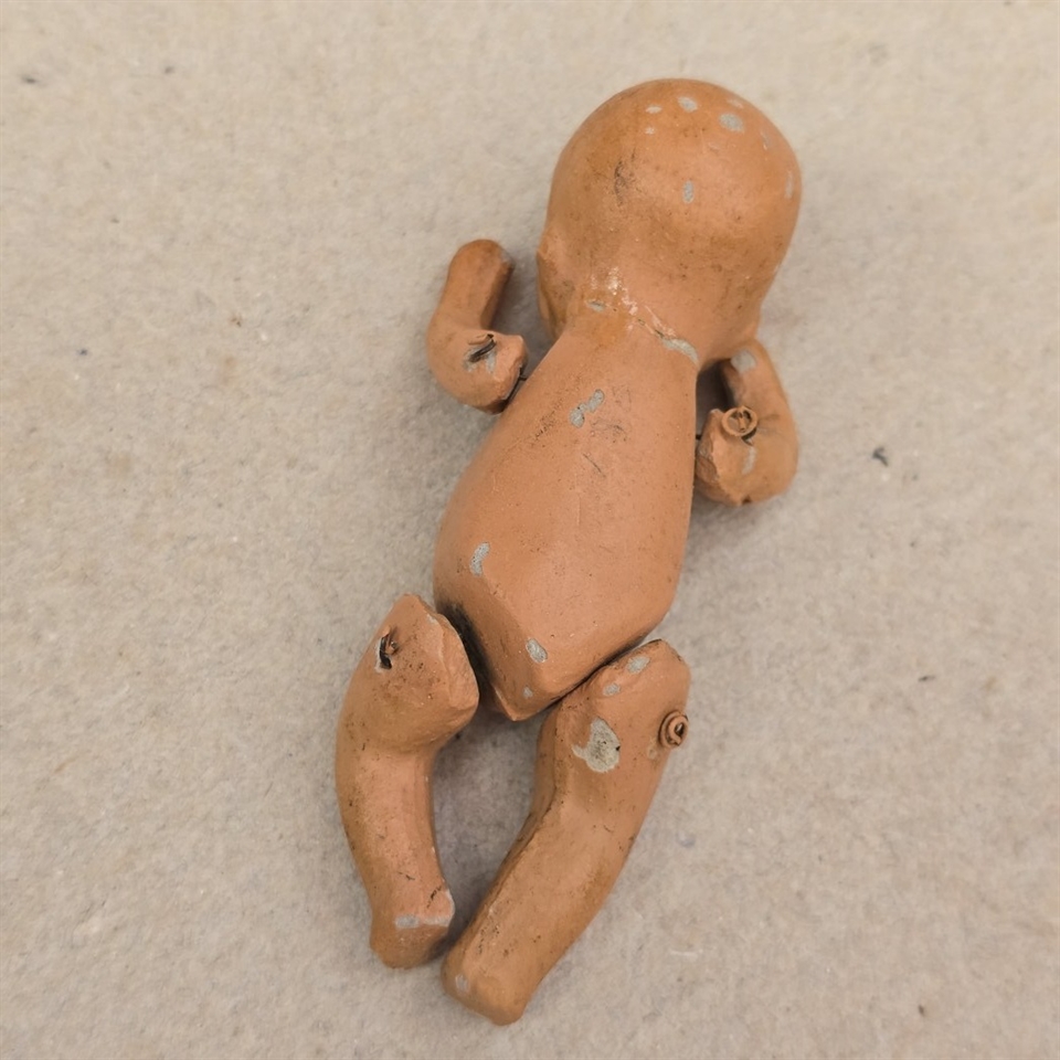 Opdag charmen af denne bedårende Lille Patineret Baby Keramikdukke, der måler kun 8,5 cm. i længden! Denne nøje udformede dukke er perfekt for samlere og enhver, der værdsætter fine antikviteter.