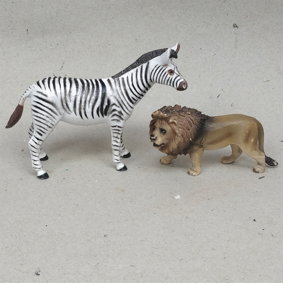 Opdag nostalgien med dette sæt af plastik legetøjsdyr, bestående af en løve fra 2005, fremstillet af Schleich og en zebra fra China.