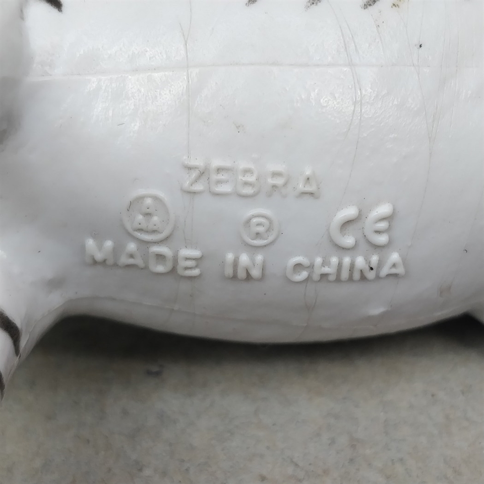 Zebraen, stående 11 cm. høj, fanger øjet med sine karakteristiske sort-hvide striber, perfekt genskabt i holdbar plast.