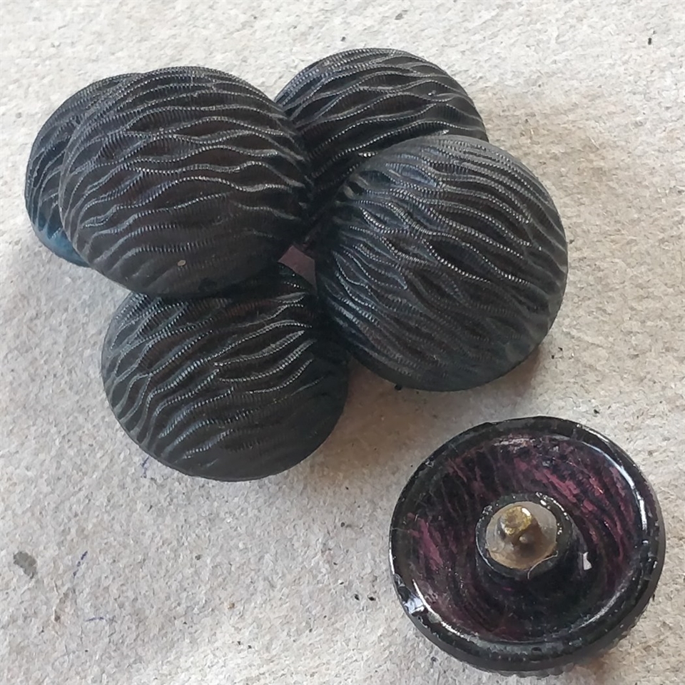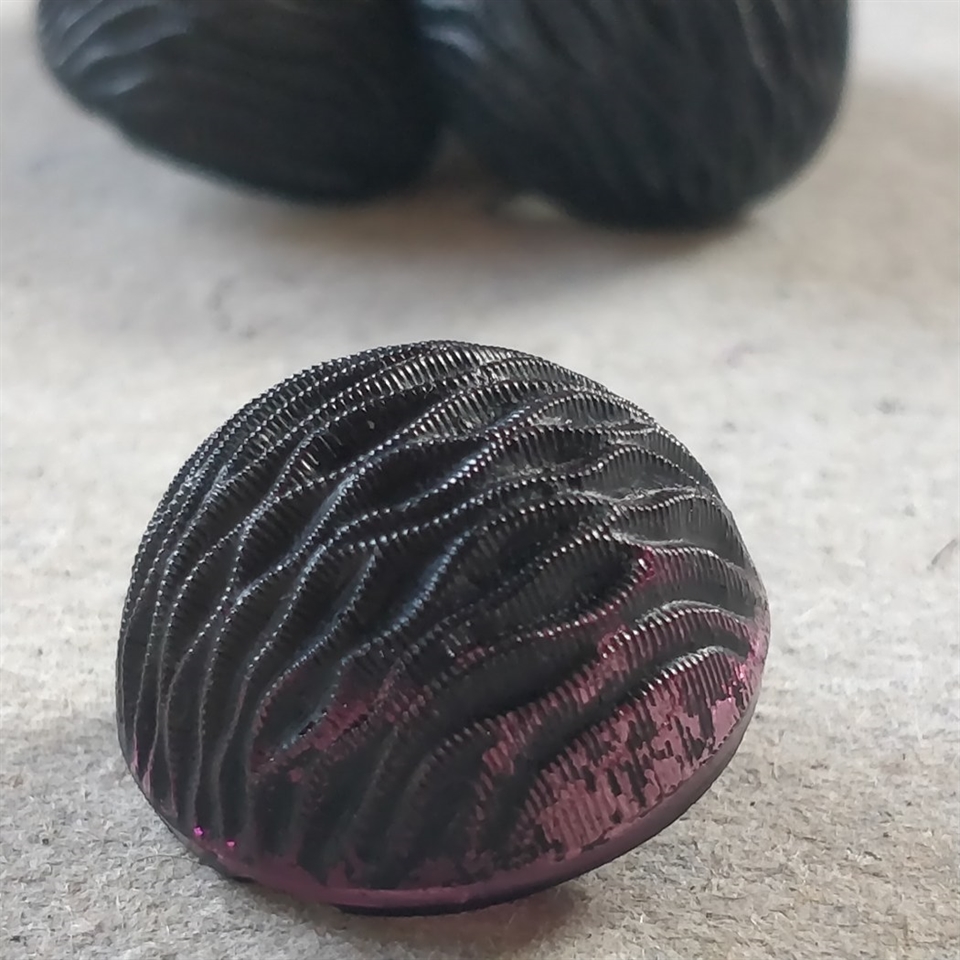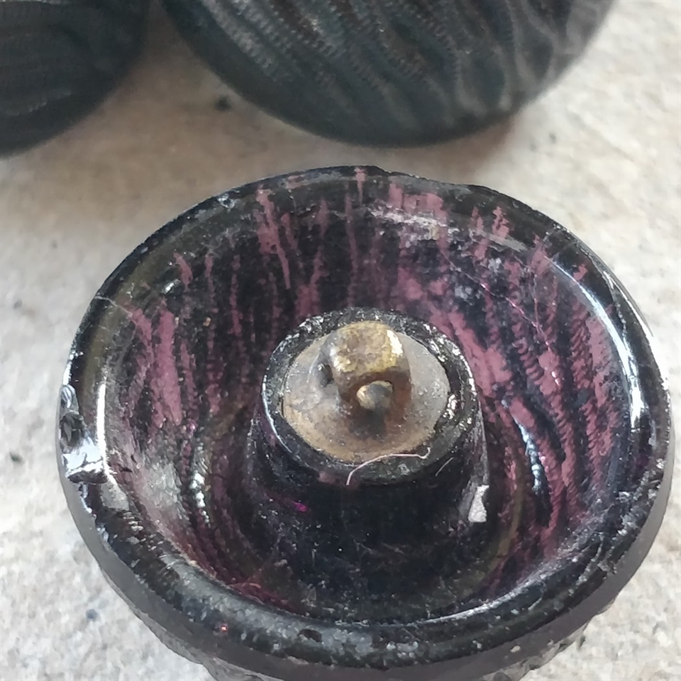 Disse halvkugleformede knapper er detaljeret med fine riller og en matsort overflade, der giver et sofistikeret look, mens det lilla glas på undersiden tilføjer et diskret farvetouch, hvor patineringer slår igennem.