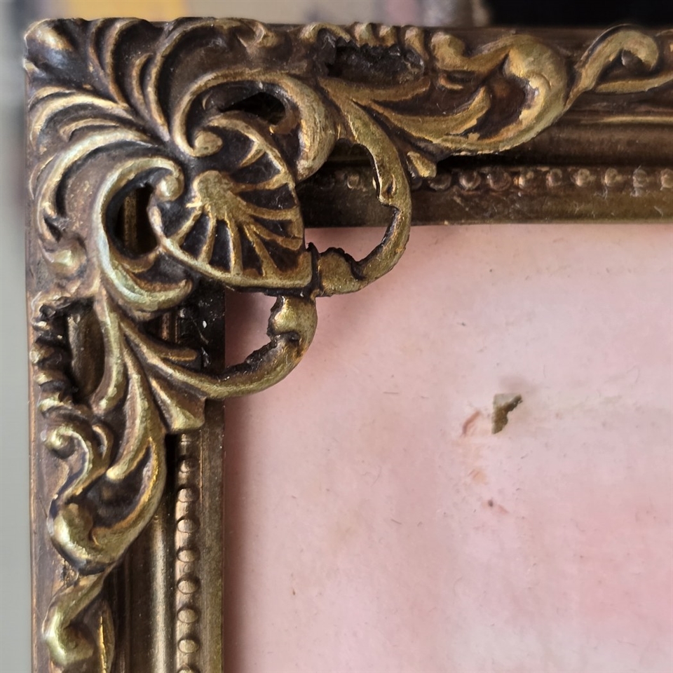 Oplev den uforlignelige elegance med vores "Messing blonde hjørner på gammel billedramme", en sand perle for enhver kunstsamler eller interiørentusiast.