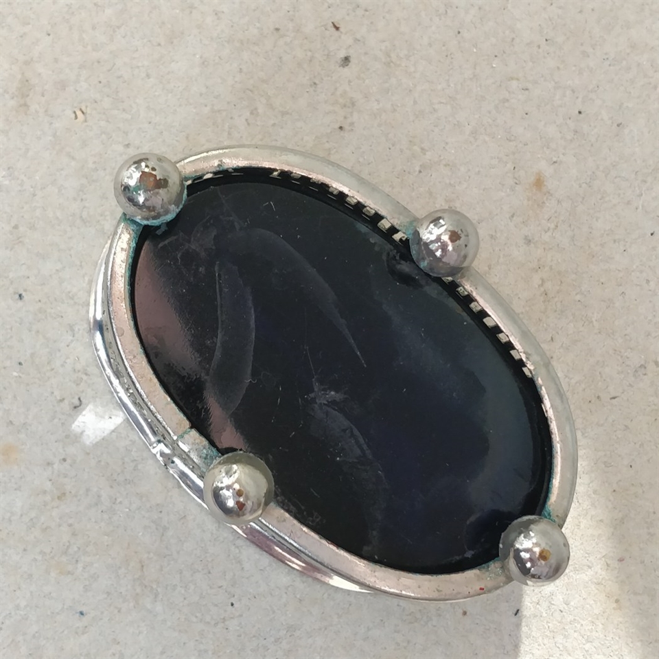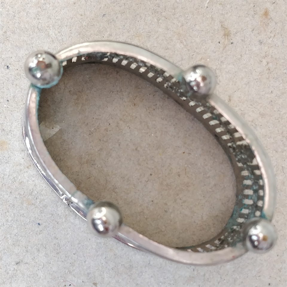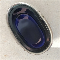 Produktet har en oval form og er udstyret med en smuk blå glasindsats, der sikkert vil fange øjet.