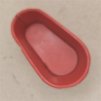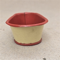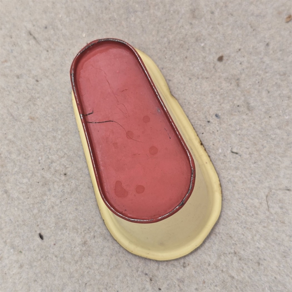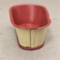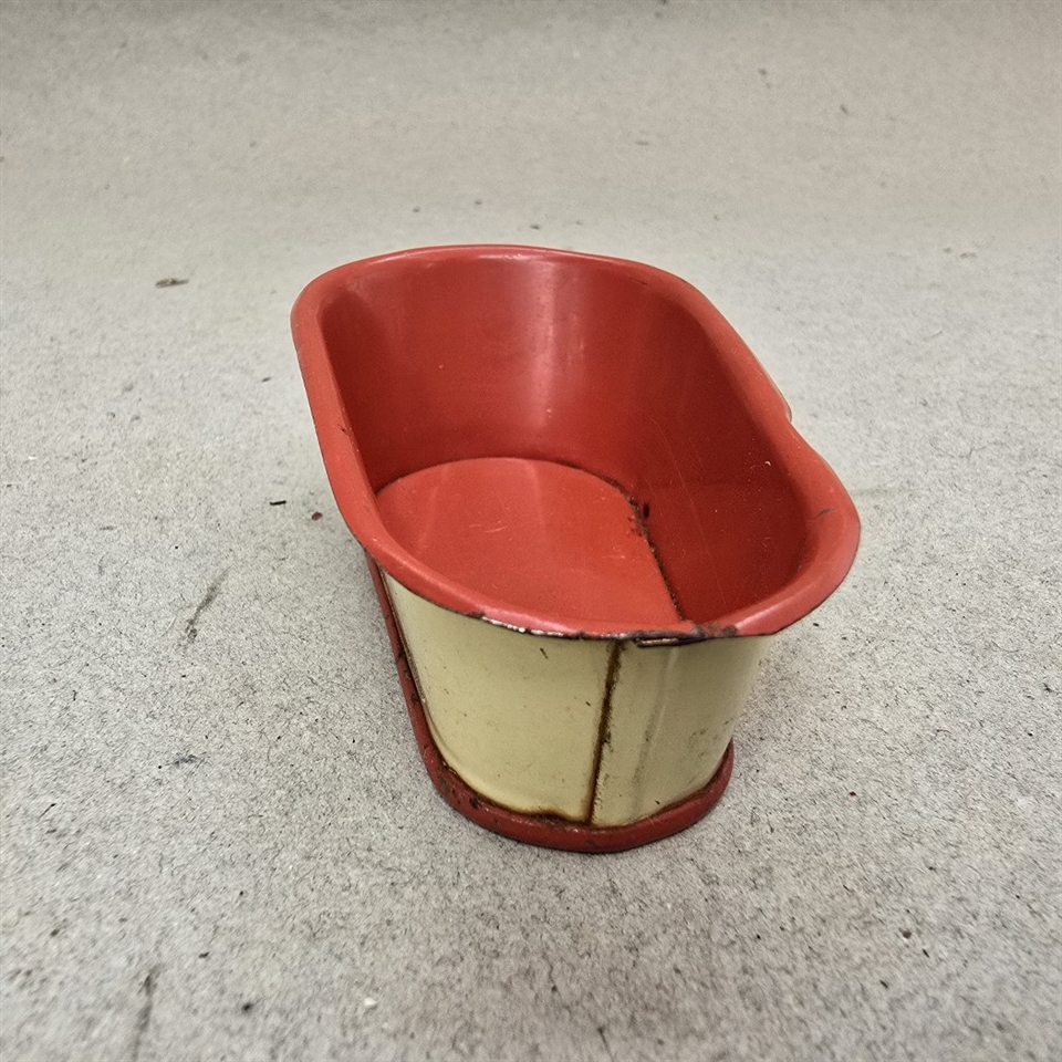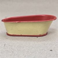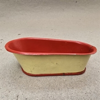 Badekaret er fremstillet i metal og har en klassisk oval form, der måler 9 x 5 cm. og er 3 cm. højt. Indvendigt er det malet i en livlig rød farve, mens den ydre del er i en blød cremefarve, der tilføjer et touch af vintage elegance.