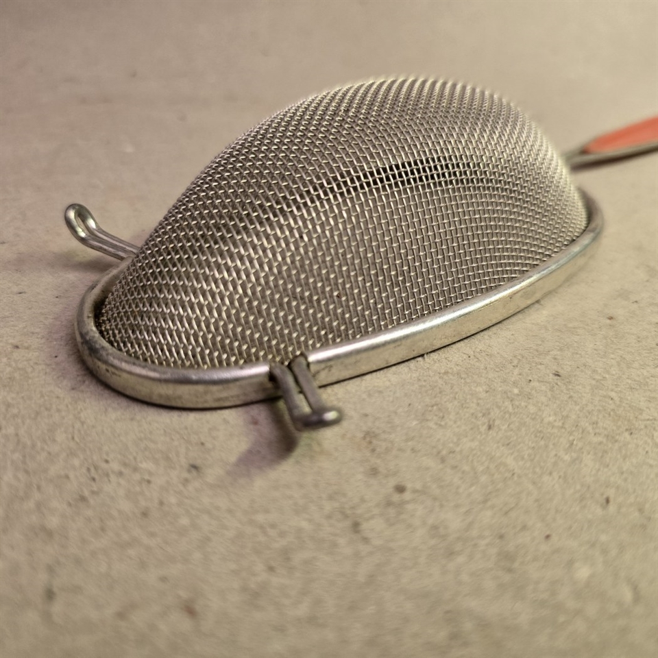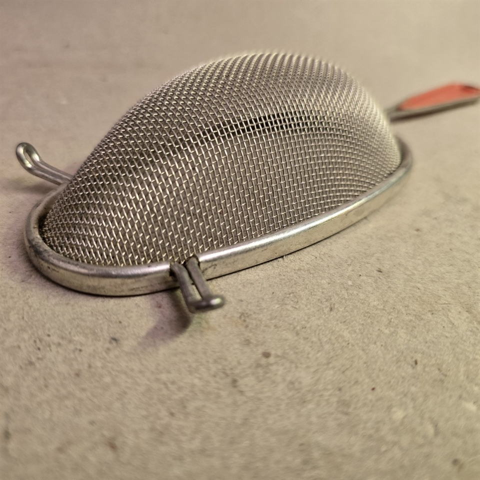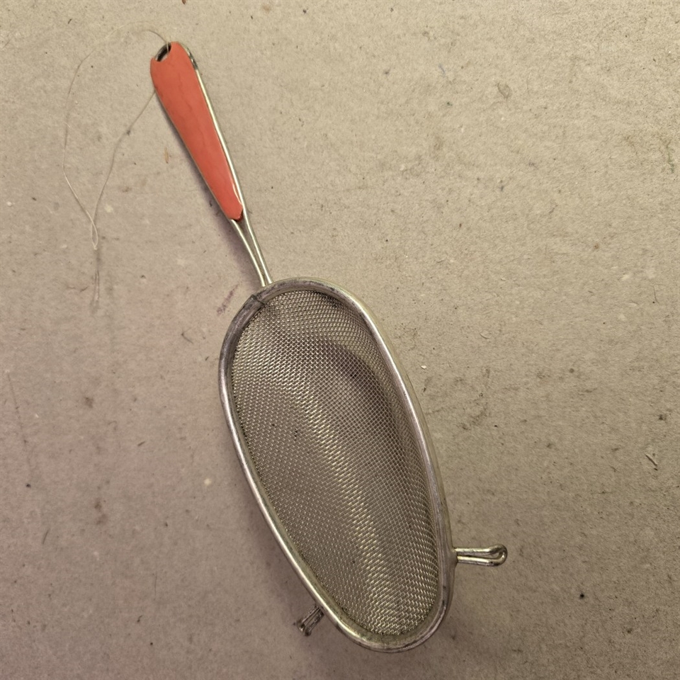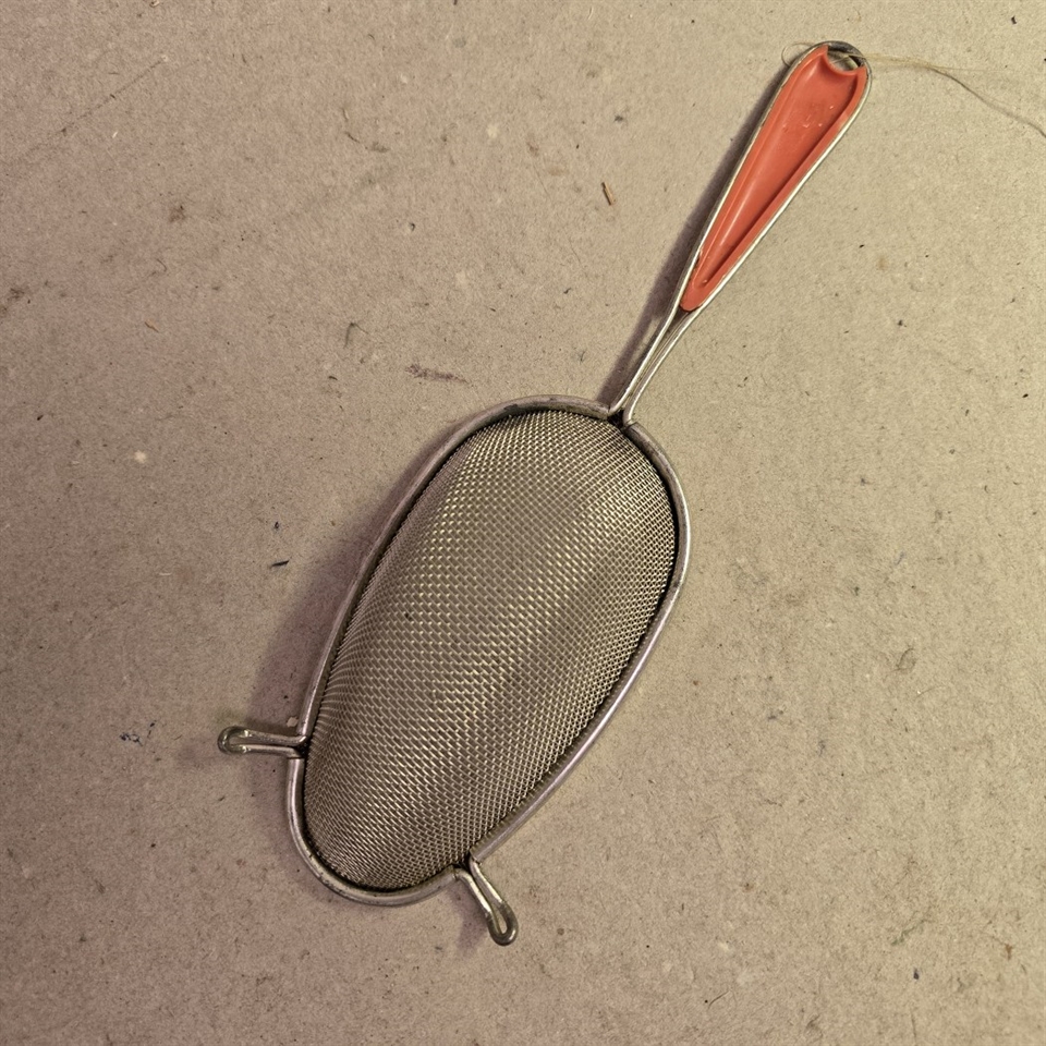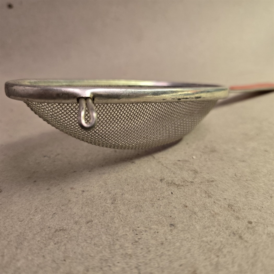 Giv dit køkken en snert af nostalgi med denne charmerende 'Metal oval sigte med rødt plastikhåndtag' – et must-have for enhver retroentusiast eller moderne kok, der værdsætter et strejf af det klassiske.