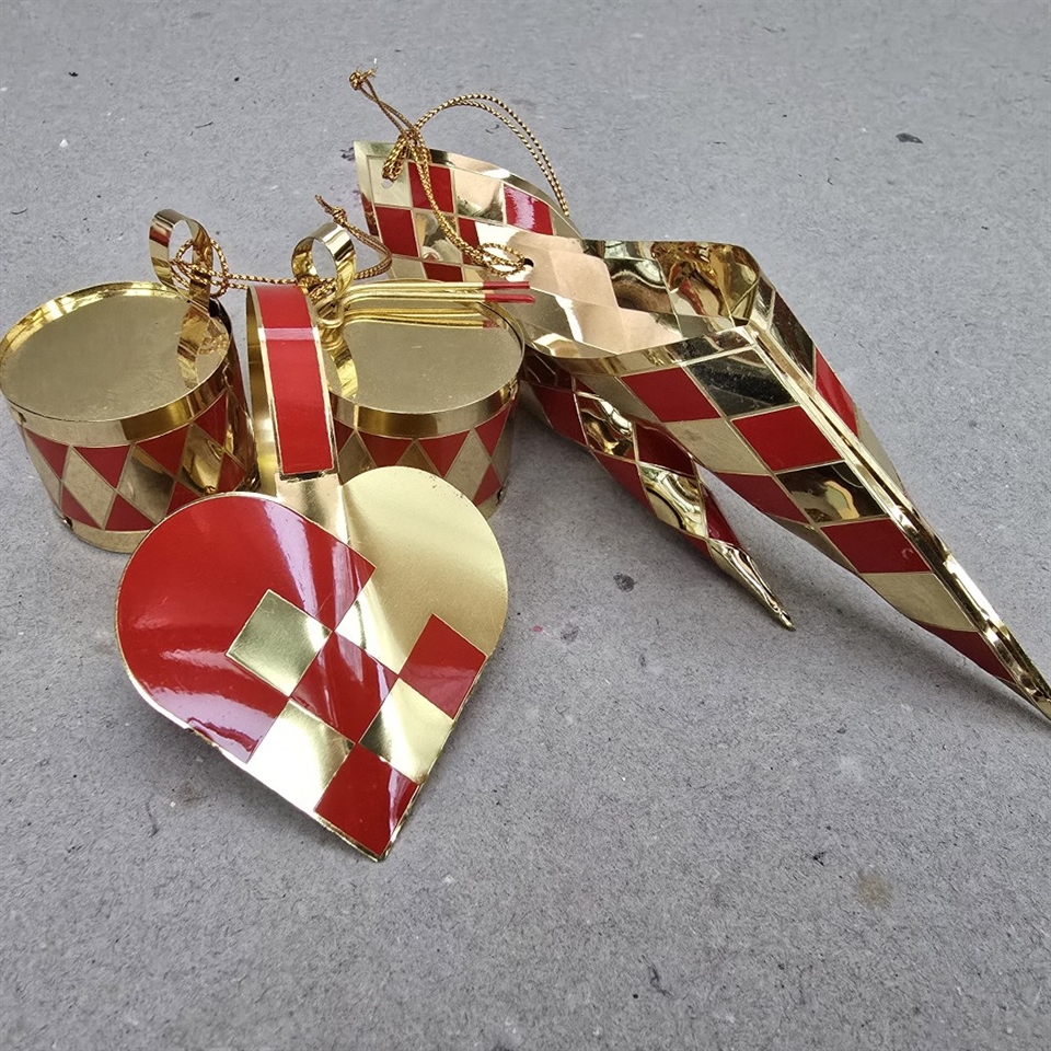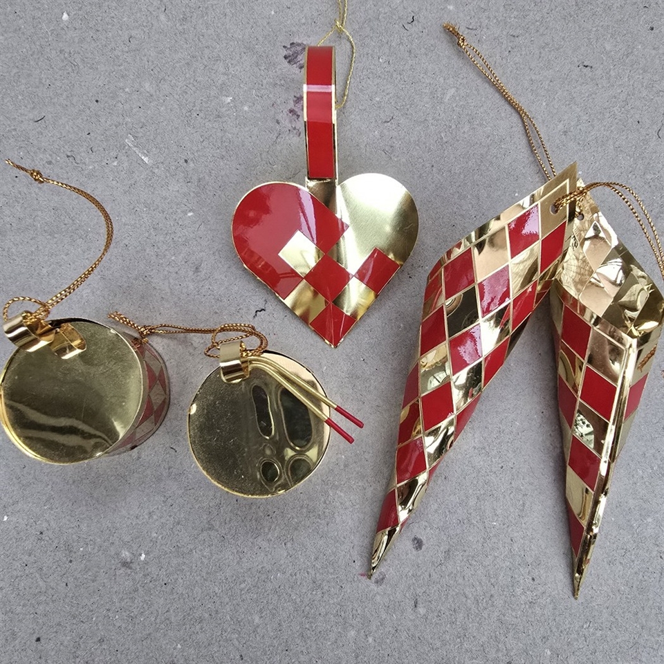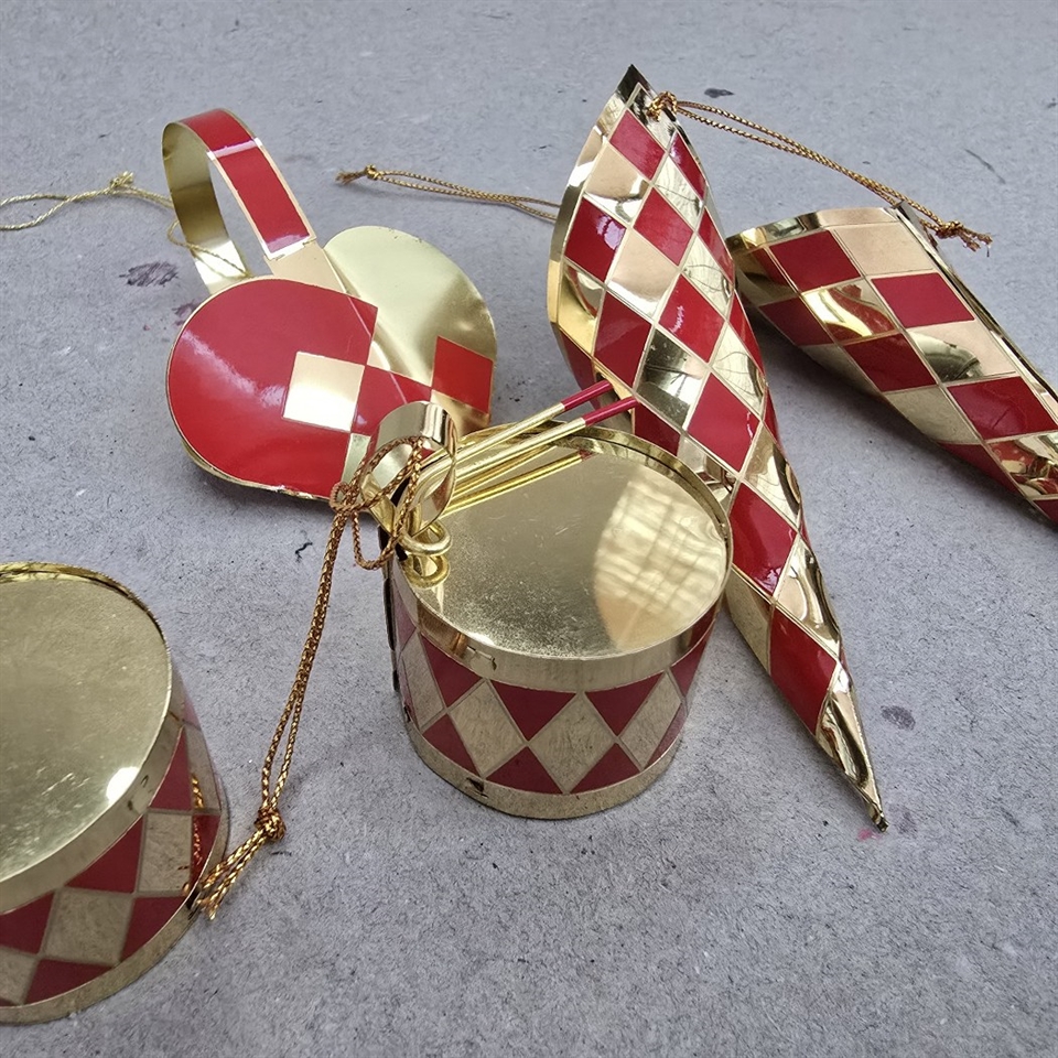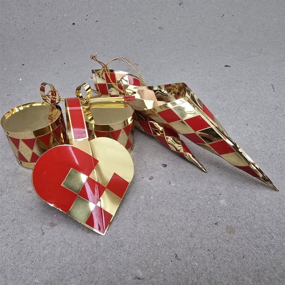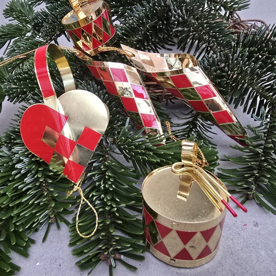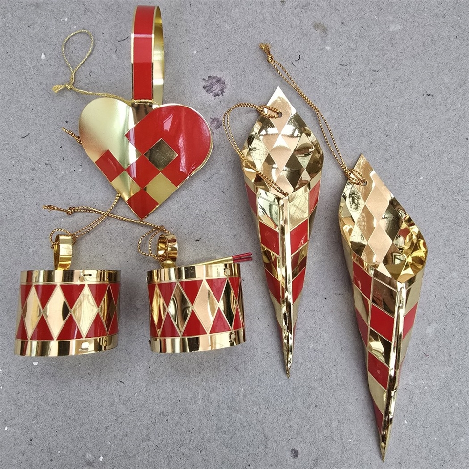 Sættet inkluderer hjerte, kræmmerhuse og små trommer, alle smukt udført i skinnende rødt og guld.