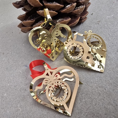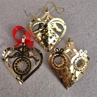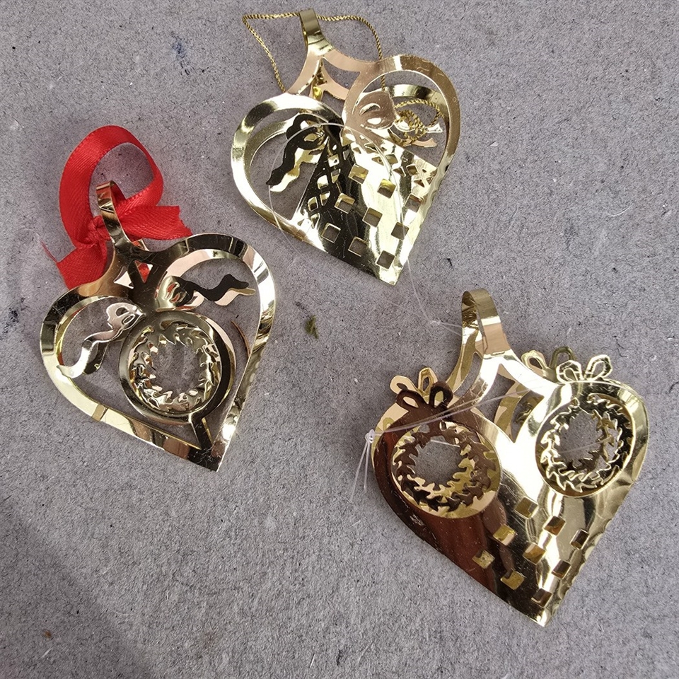 Disse tre bedårende hjerter, fremstillet i skinnende metalfolie, tilføjer en glimtende elegance til din juleudsmykning.
