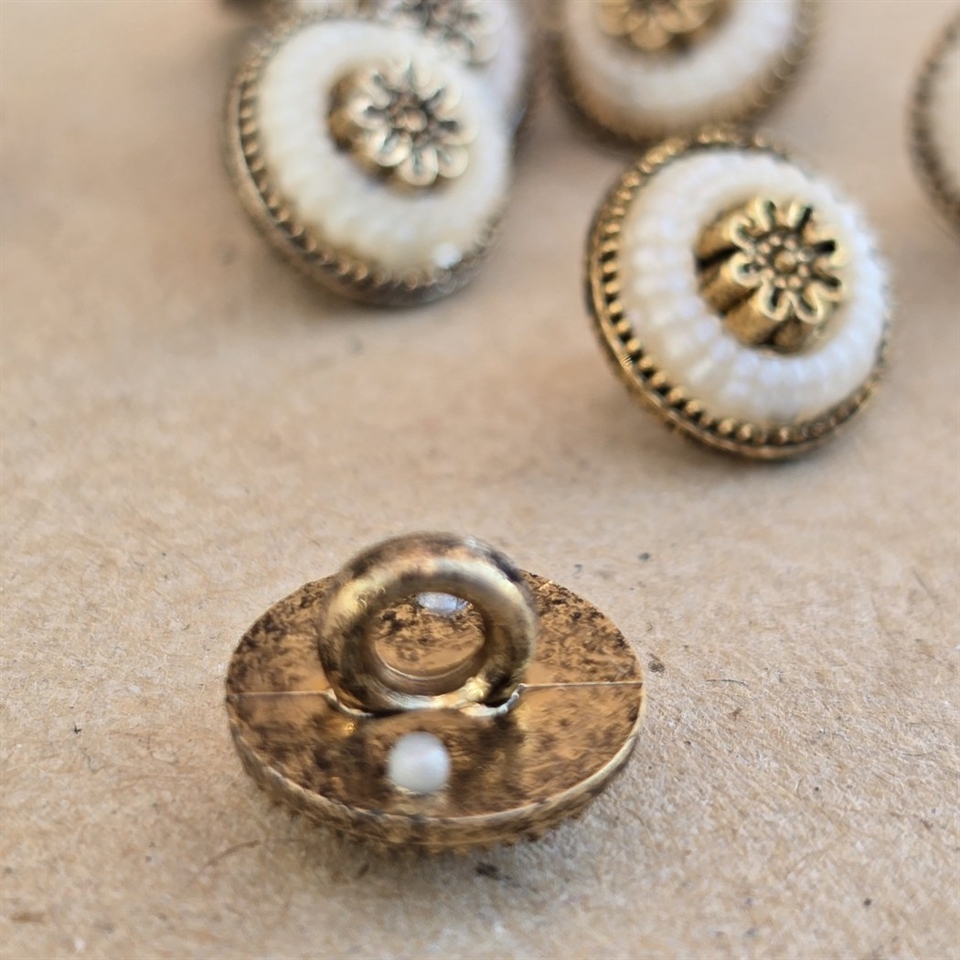 Opgrader dit håndarbejde eller tøj med disse charmerende 'Mini guld, hvide vintage knapper'.