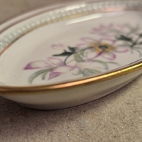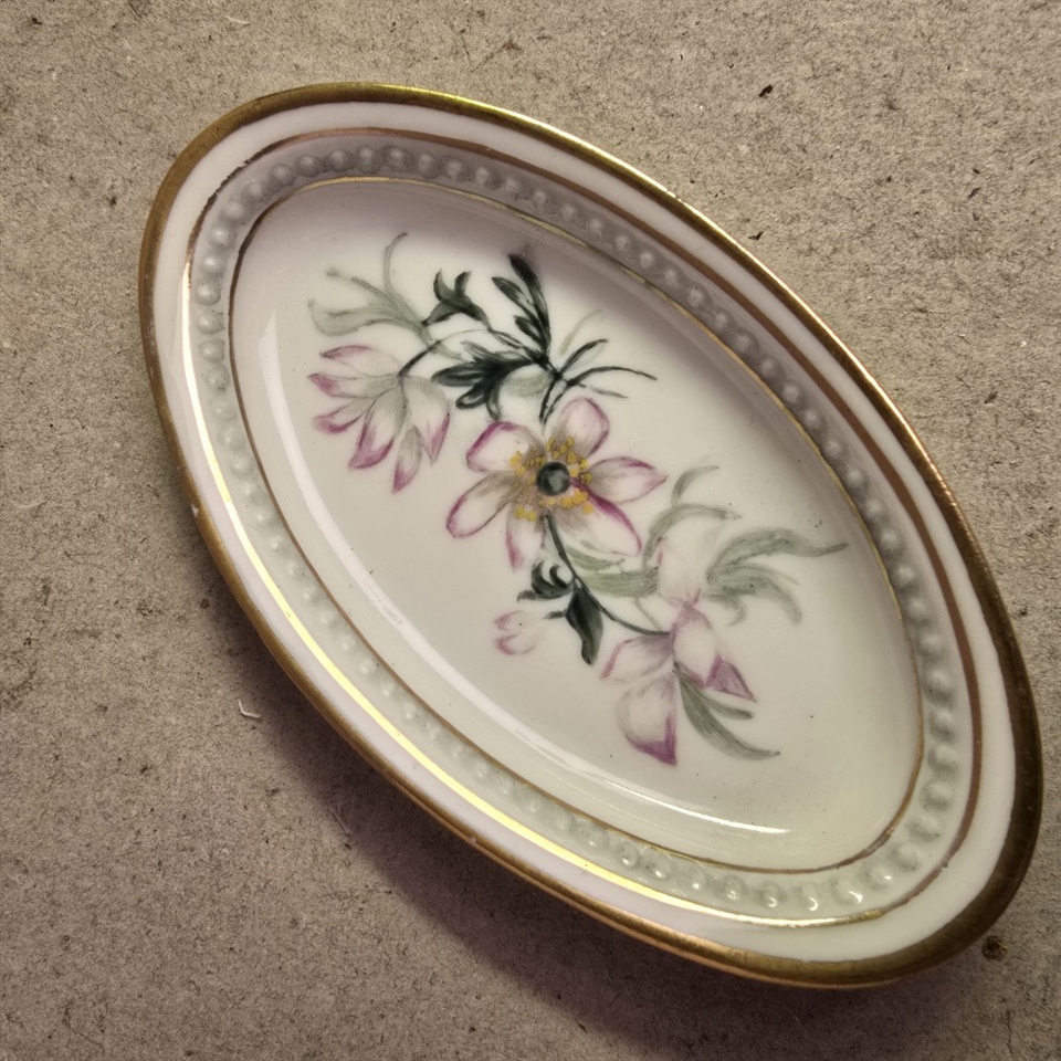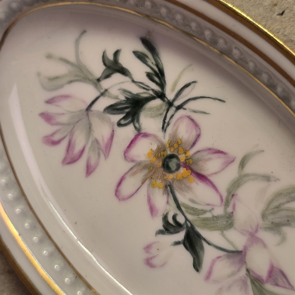 Opdag charmen og elegance med vores 'Mini ovalt porcelænsfad, blomsterdekoreret i år 1923' – et mesterværk i dit hjem, der tilføjer et strejf af historisk skønhed. Dette delikate, ovale porcelænsfad er prydet med håndmalede, farverige blomstermotiver og en indbydende guldkant, som sammen skaber en ægte visuel fest.