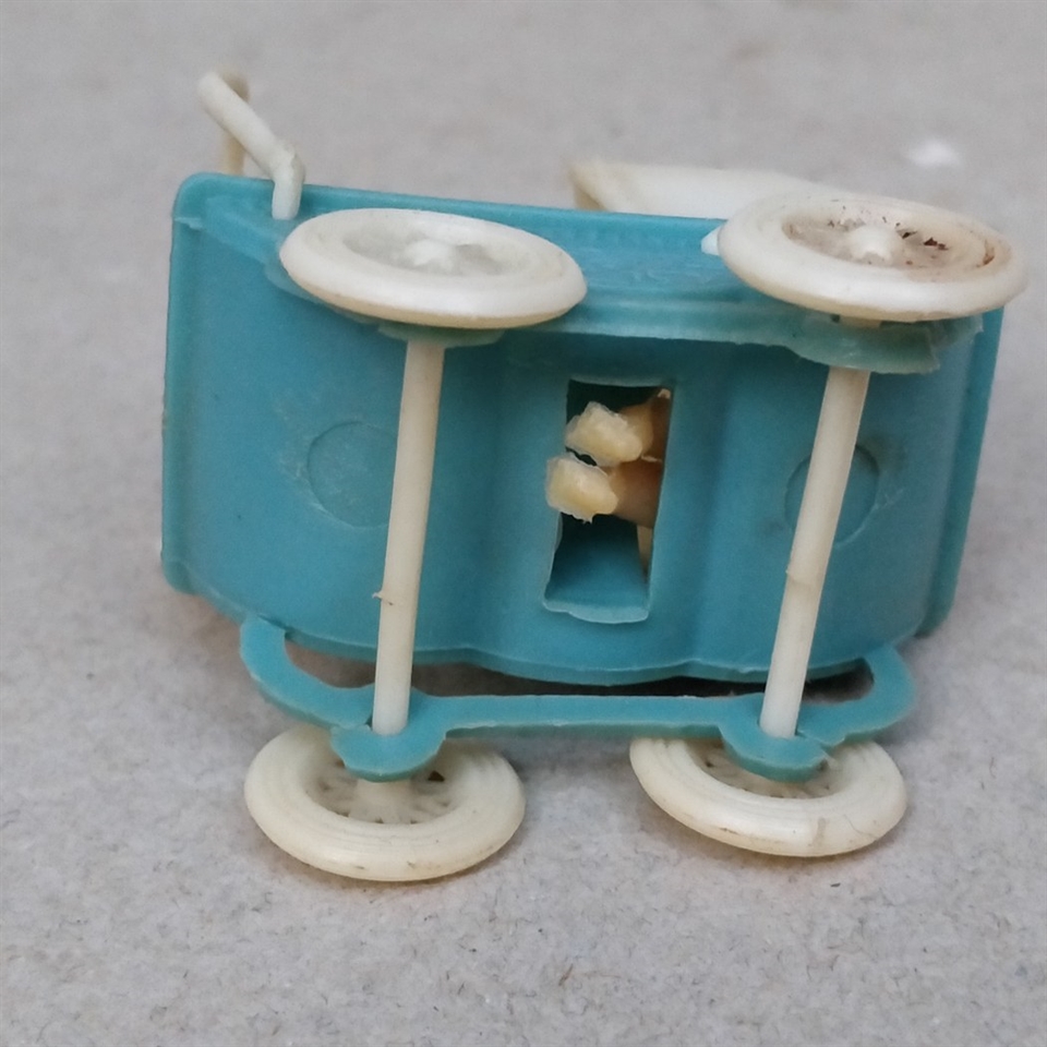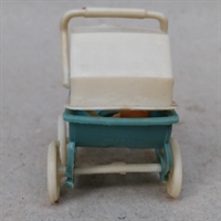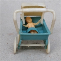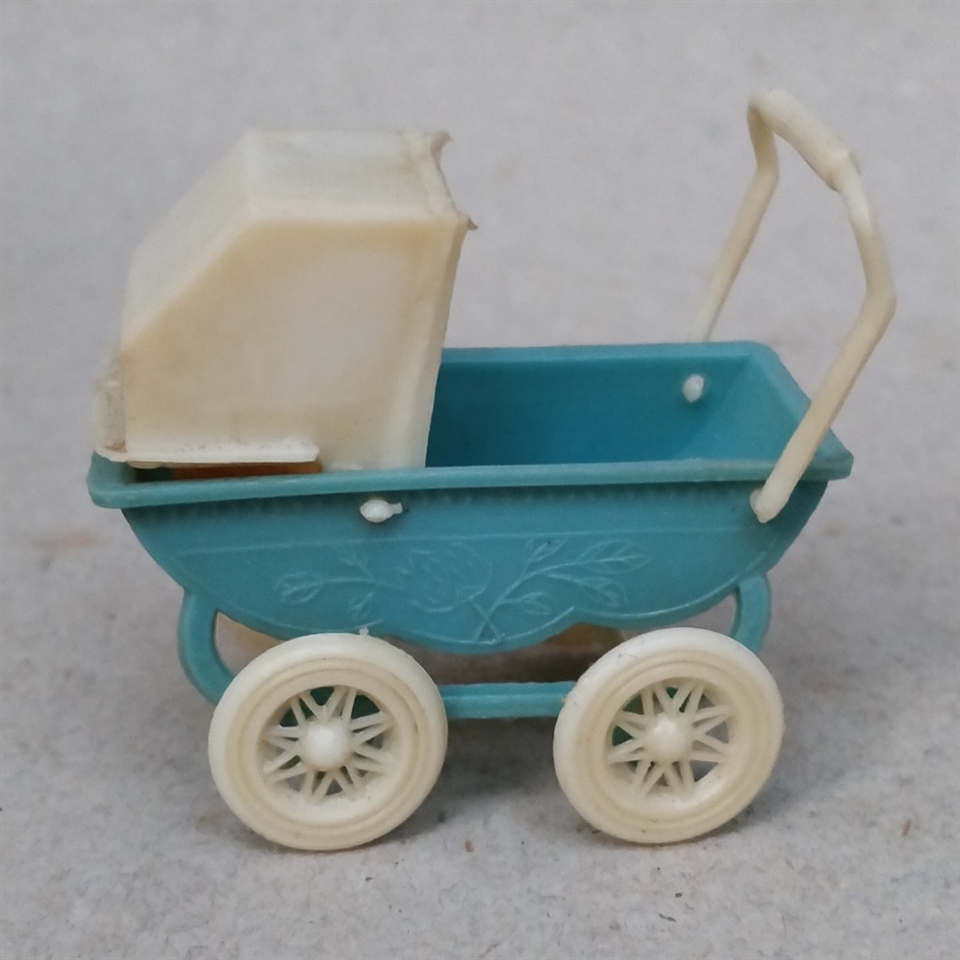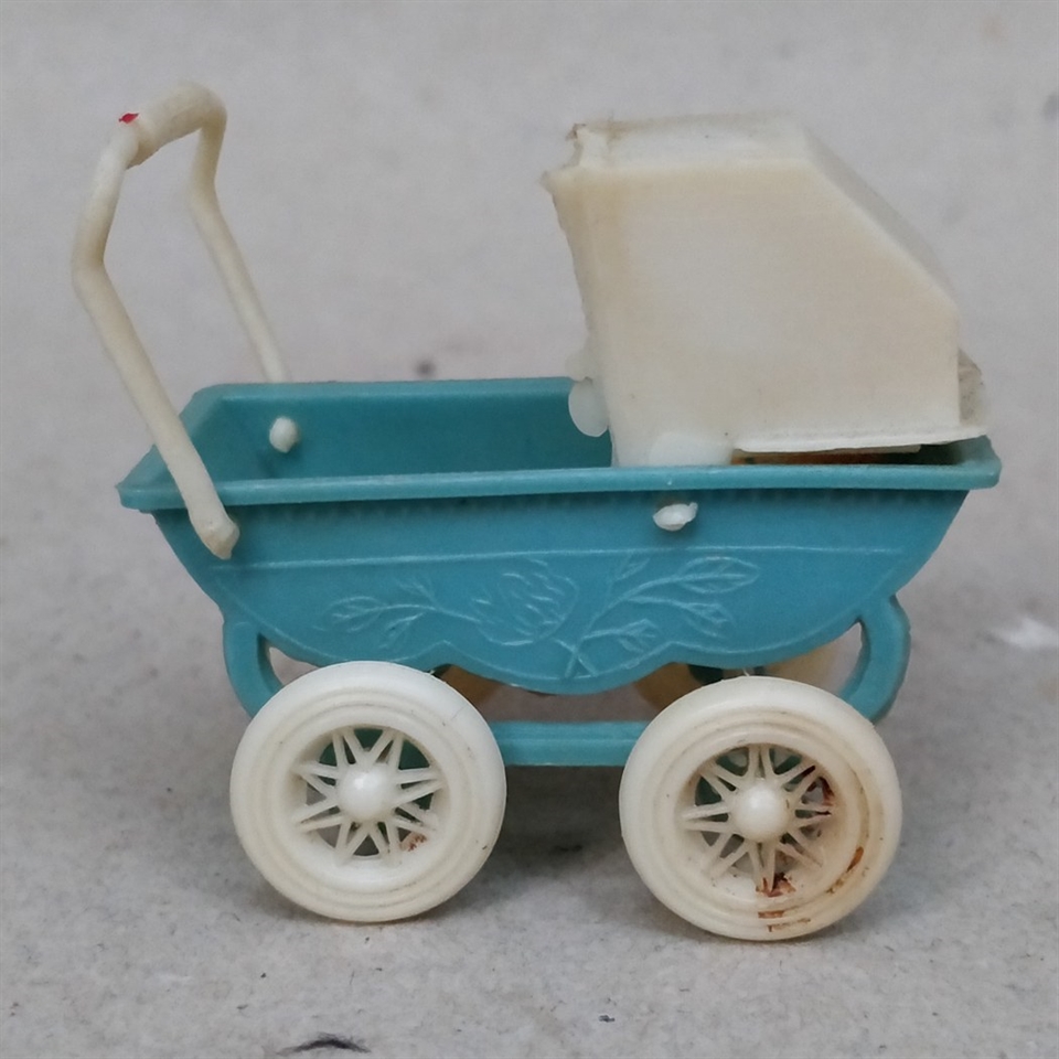 Dukkevognen er fremstillet i blå og hvid plastik og måler kun 4,3 cm. i højden, hvilket gør den ideel til miniaturelegetøjssamlinger eller som en unik dekoration i hjemmet.
