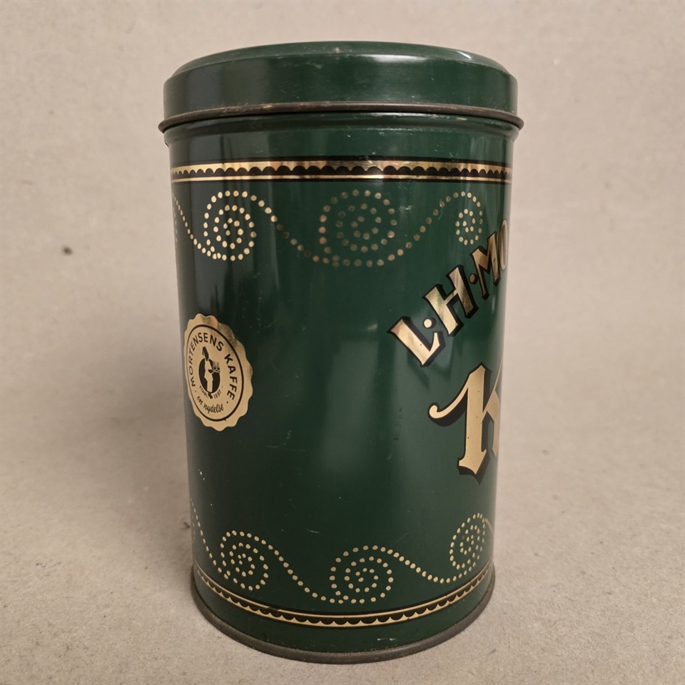 Dåsen er fremstillet i metal og prydes af en dyb mørkegrøn farve, mens elegante guldbogstaver stolt annoncerer arven fra L.H. Mortensen, Vejle.