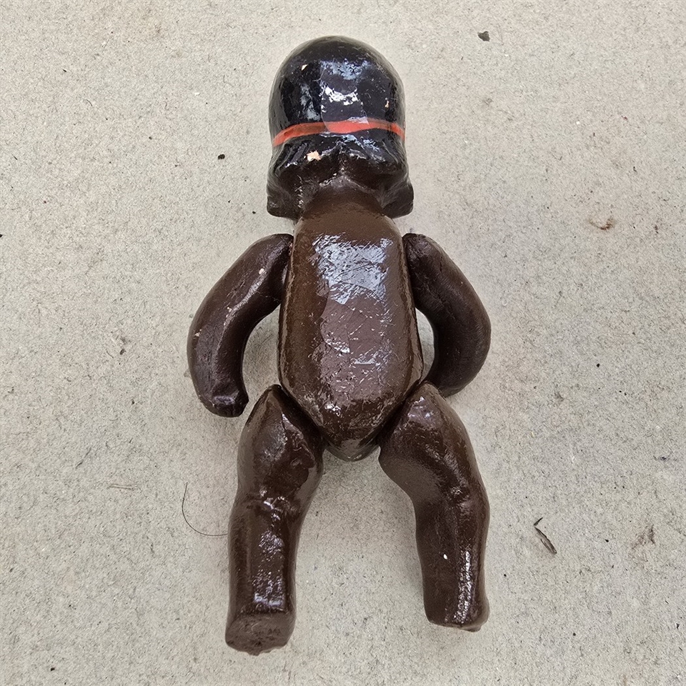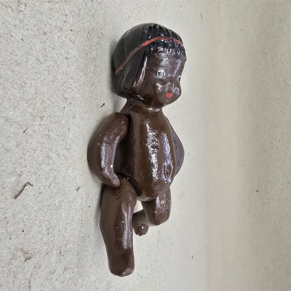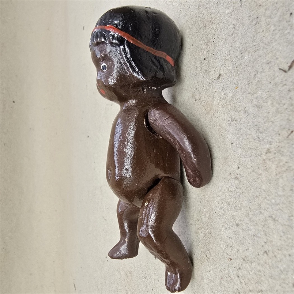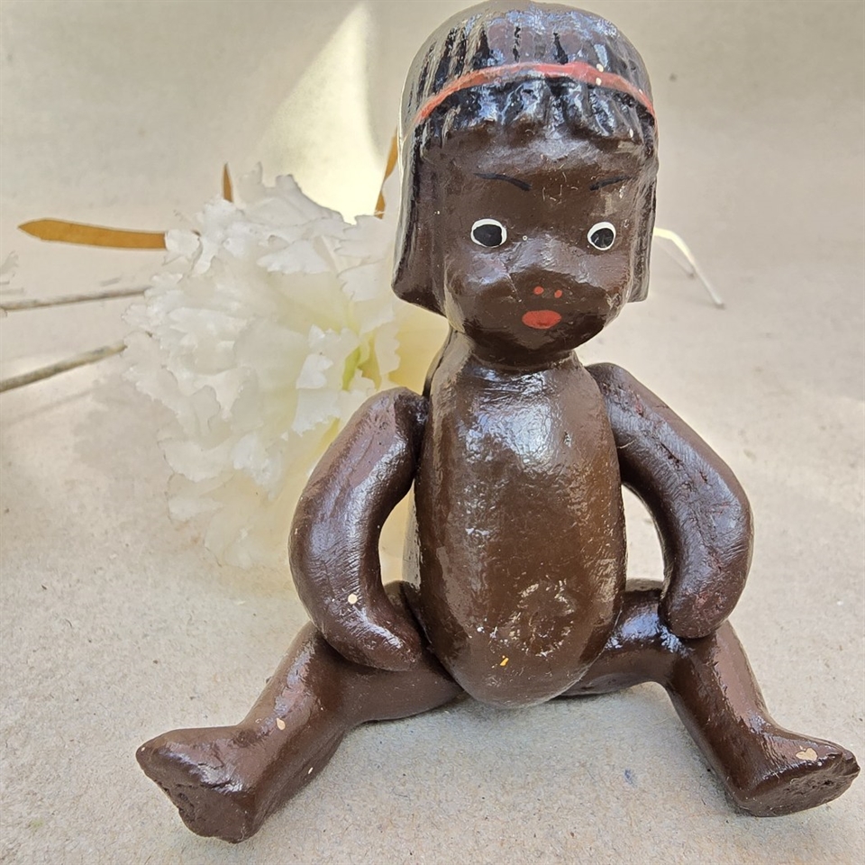 Dukken har karakteristiske træk som sort pagehår og et iøjnefaldende rødt pandebånd, der tilføjer en livlig kontrast til dens mørke hudtone. Denne sjældne dukke er ikke blot et stykke legetøj, men et stykke kulturhistorie, der kan bringe nostalgi og charme til enhver samling.