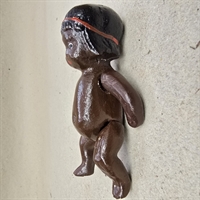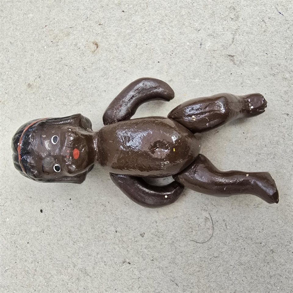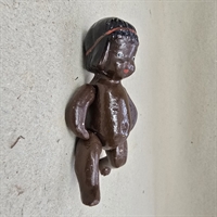 Oplev charmen og historien med denne unikke 'Mørkhudet dukke, gammel keramikdukke'! Perfekt til samlere og legetøjsentusiaster, denne nøje bevarede keramikdukke måler 11,5 cm. i længden og fremviser et imponerende håndværk fra en svunden tid.