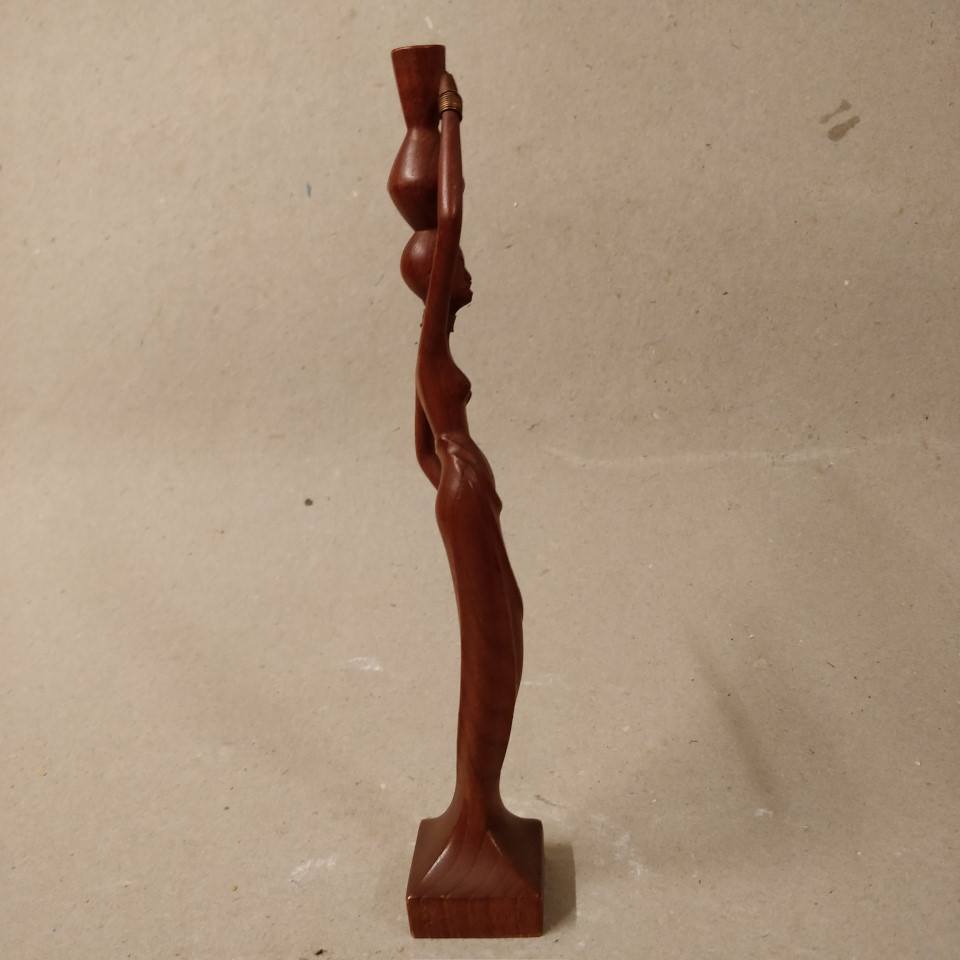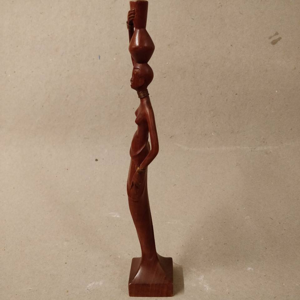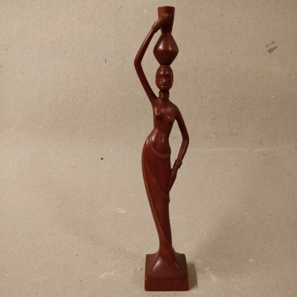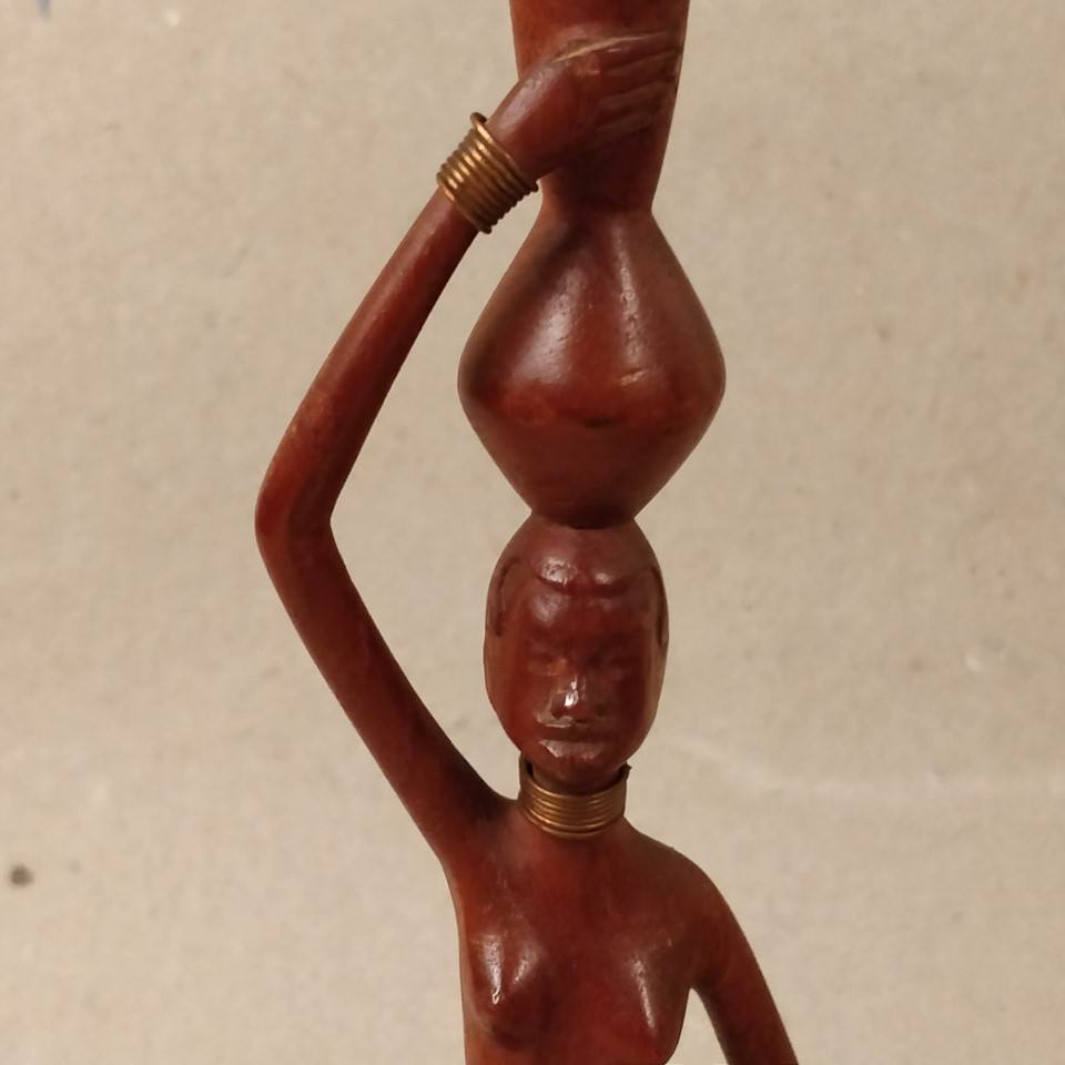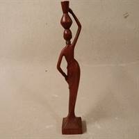 Afro kvinde med krukke på hovedet, skåret i træ.
