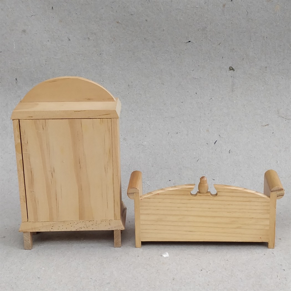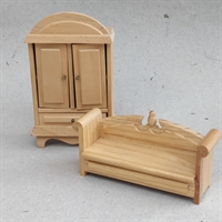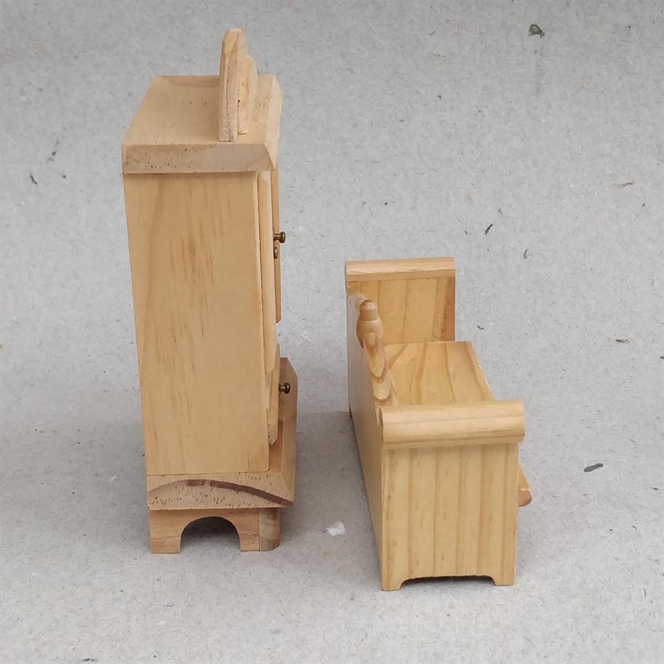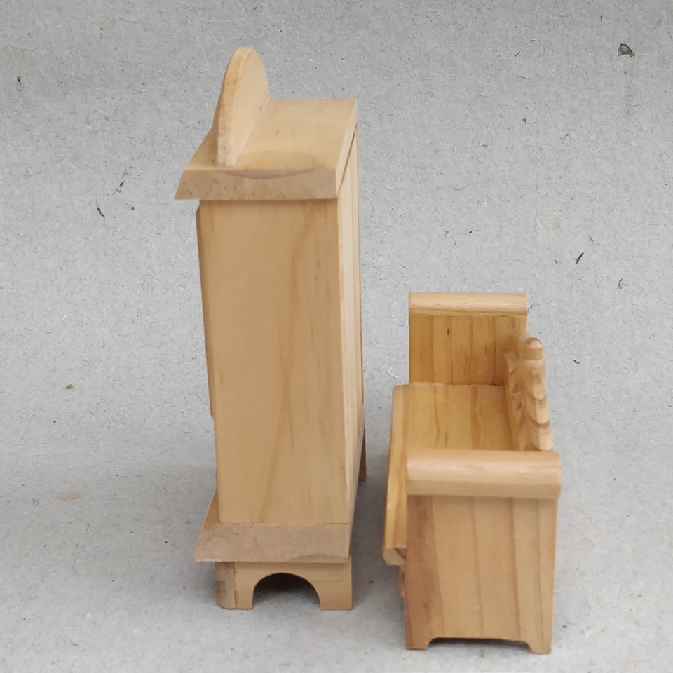 Dette sæt består af et to-dørs klædeskab og en slagbænk, begge fremstillet i smukt naturtræ, der tilfører en autentisk og tidløs elegance til ethvert dukkehus.