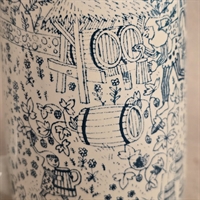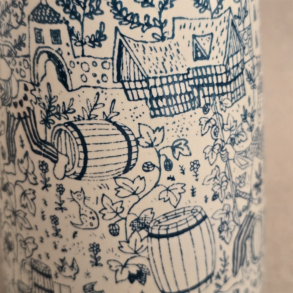 Dette tekrus er fremstillet af hvidt porcelæn, og det er dekoreret med blå stregtegninger af festlige figurer, der tilfører en livlig og kunstnerisk flair til hver eneste brug. Design Høyrup.