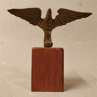 Messing figur som en ørn, placeret på en sokkel af træ.