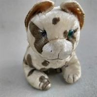 Denne søde plys kat er udført i en blød, beige plys med karakteristiske brune prikker, der tilføjer et tidløst og charmerende udtryk.