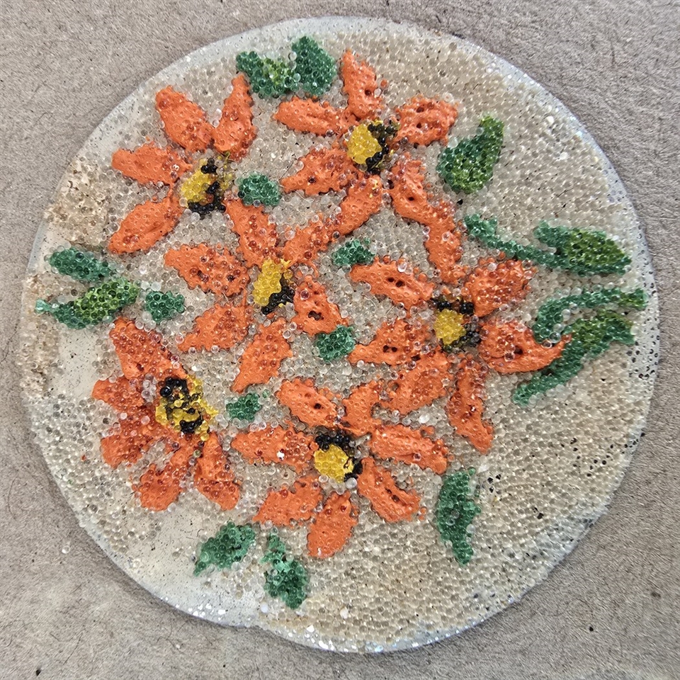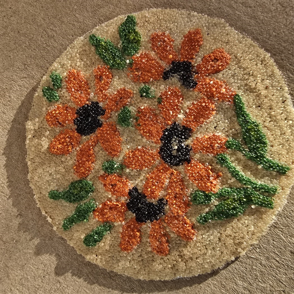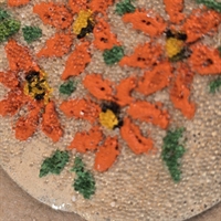 Hver buket er omhyggeligt placeret på ubrændte emaljeplader og dekoreret med fine, håndlavede mini glasperler i levende orange nuancer, der tilfører et strejf af farve og elegance.