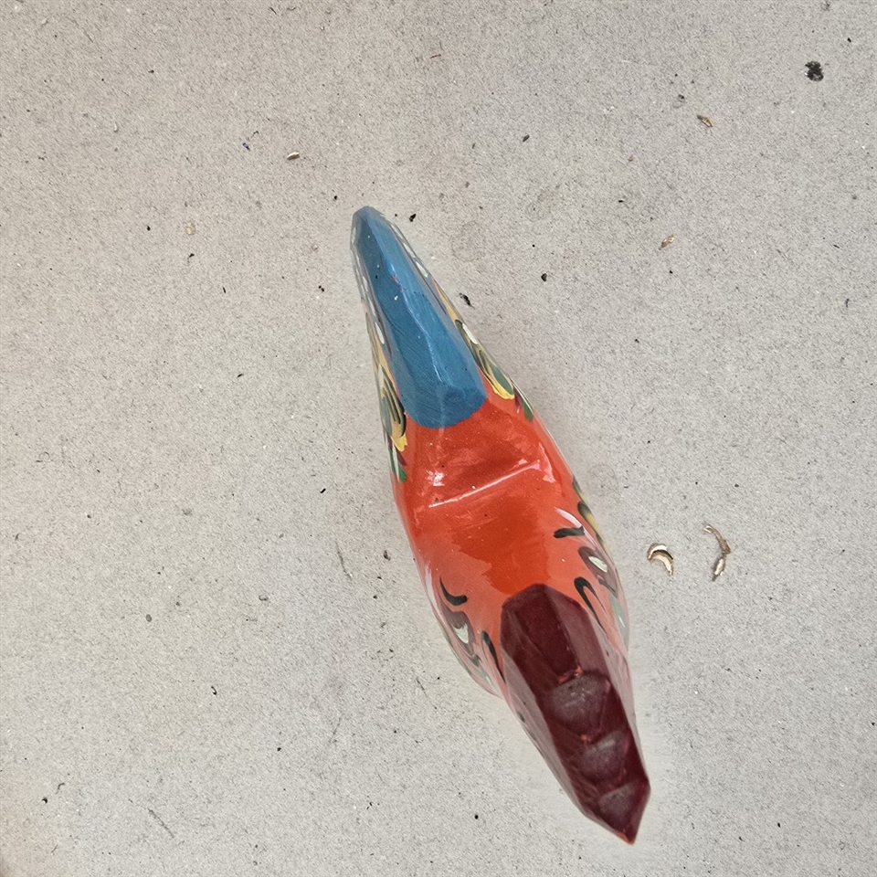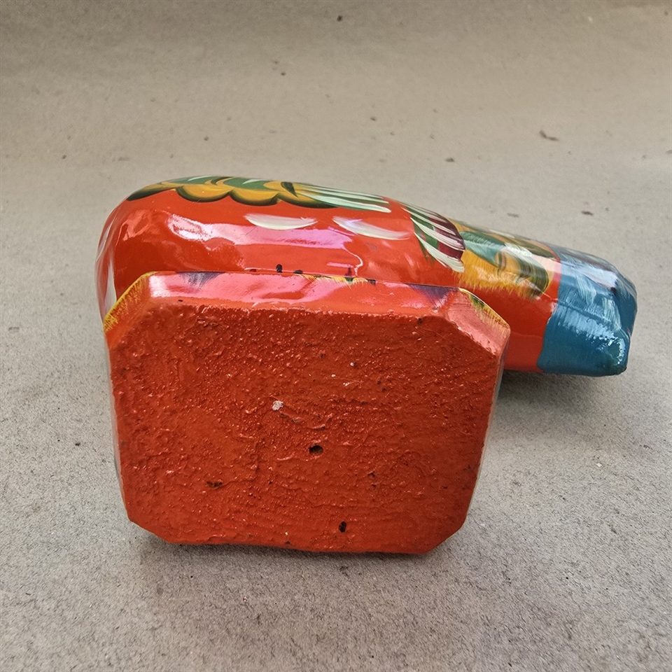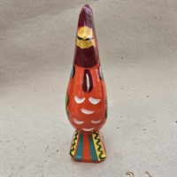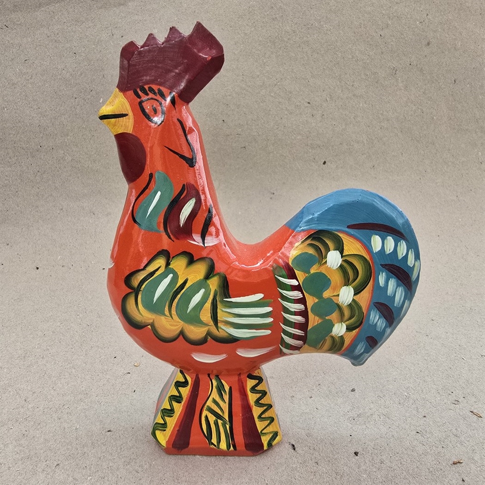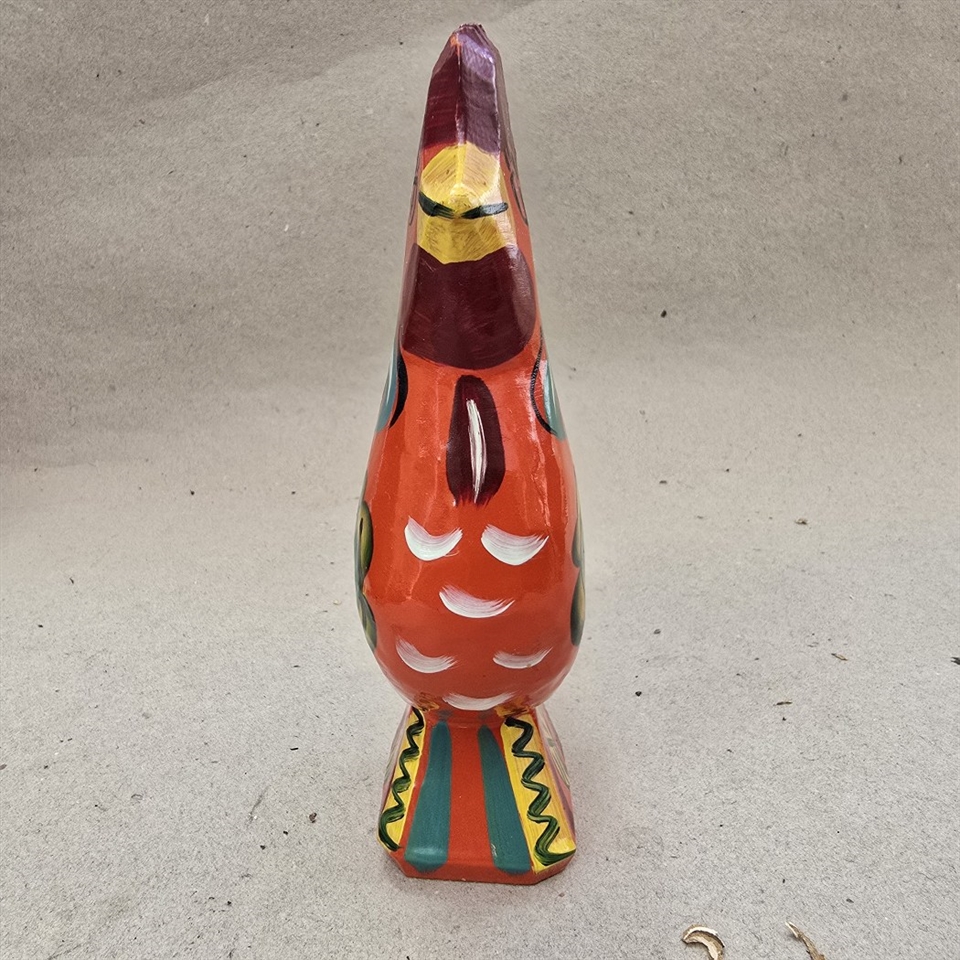 Med sin friske orangerøde farve og detaljerede håndmaling, bringer denne træhane en sjov og festlig atmosfære ind i ethvert rum.