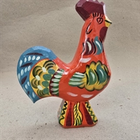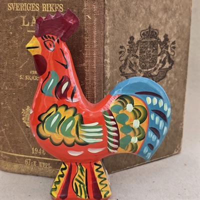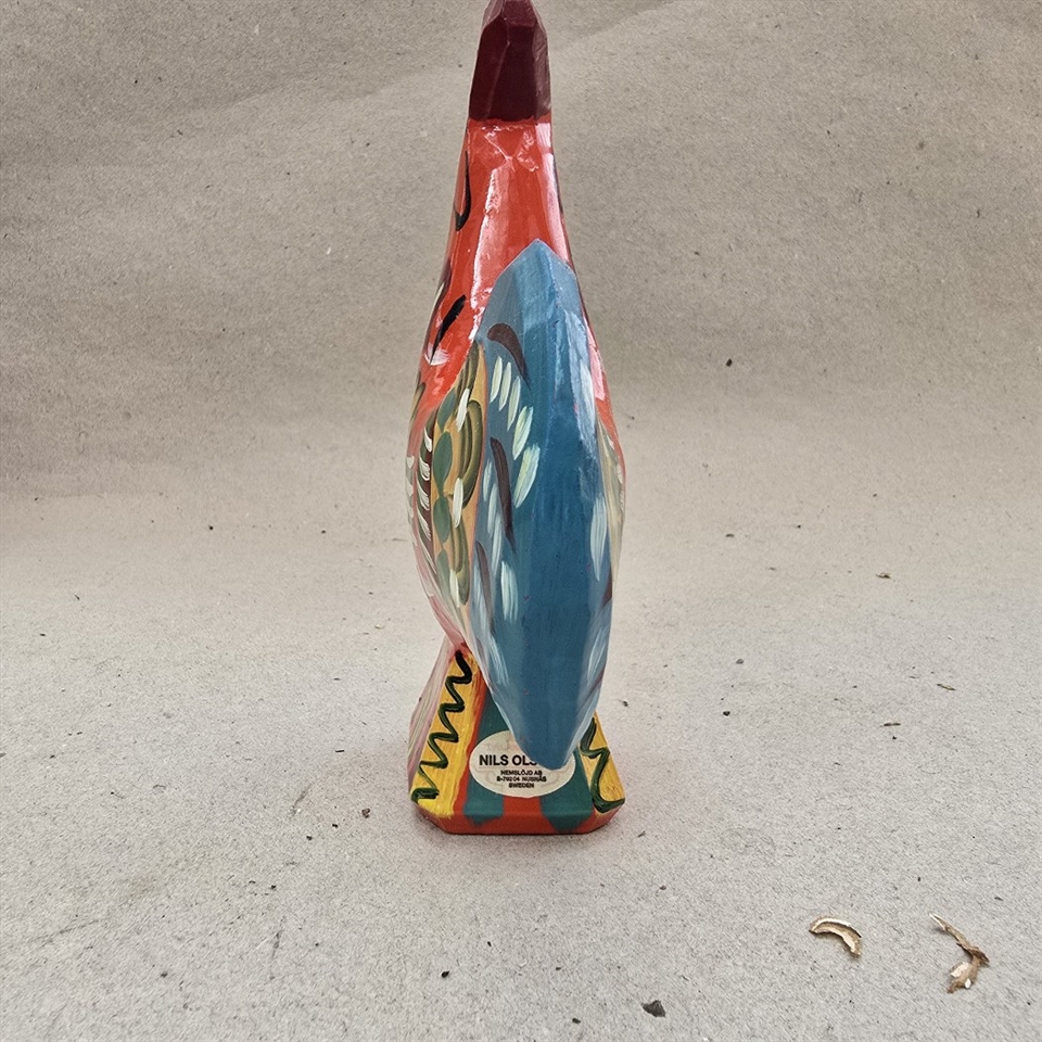 Opdag den charmerende og livlige 'Orangerød Dalahane, fint bemalet fra Nils Olsson, Nusnäs. 16,7 cm. høj.'