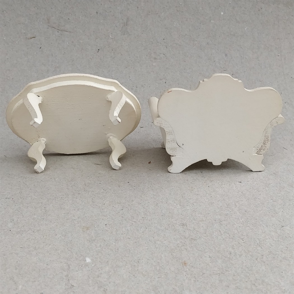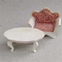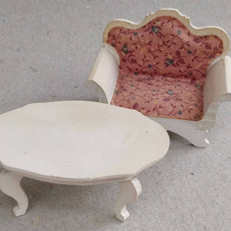 Opgrader dit dukkehus med dette charmerende sæt, som inkluderer et 'Ovalt sofabord og en polstret lænestol' - alt i retro.