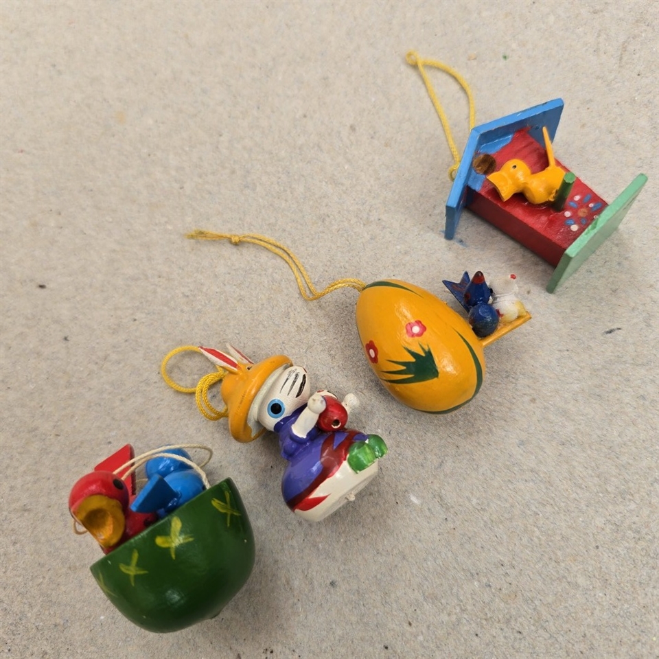Opdag charmen ved traditionel påskepynt med vores sæt af 4 vintage påskefigurer i bemalet træ.