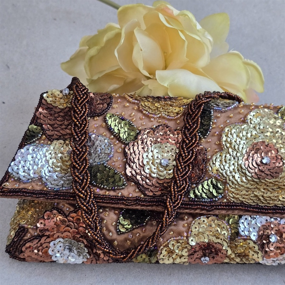 Tasken er omhyggeligt broderet med fine blomster i pailletter, der tilføjer et strejf af glamour og raffinement.