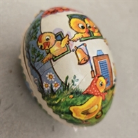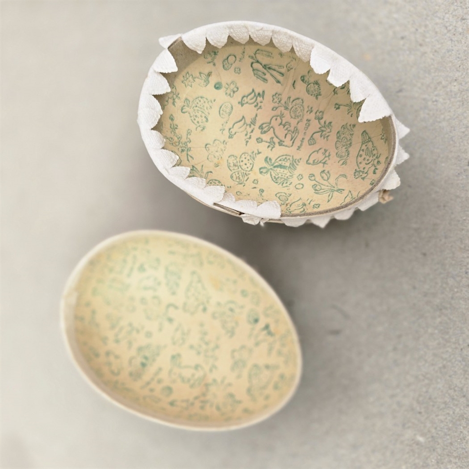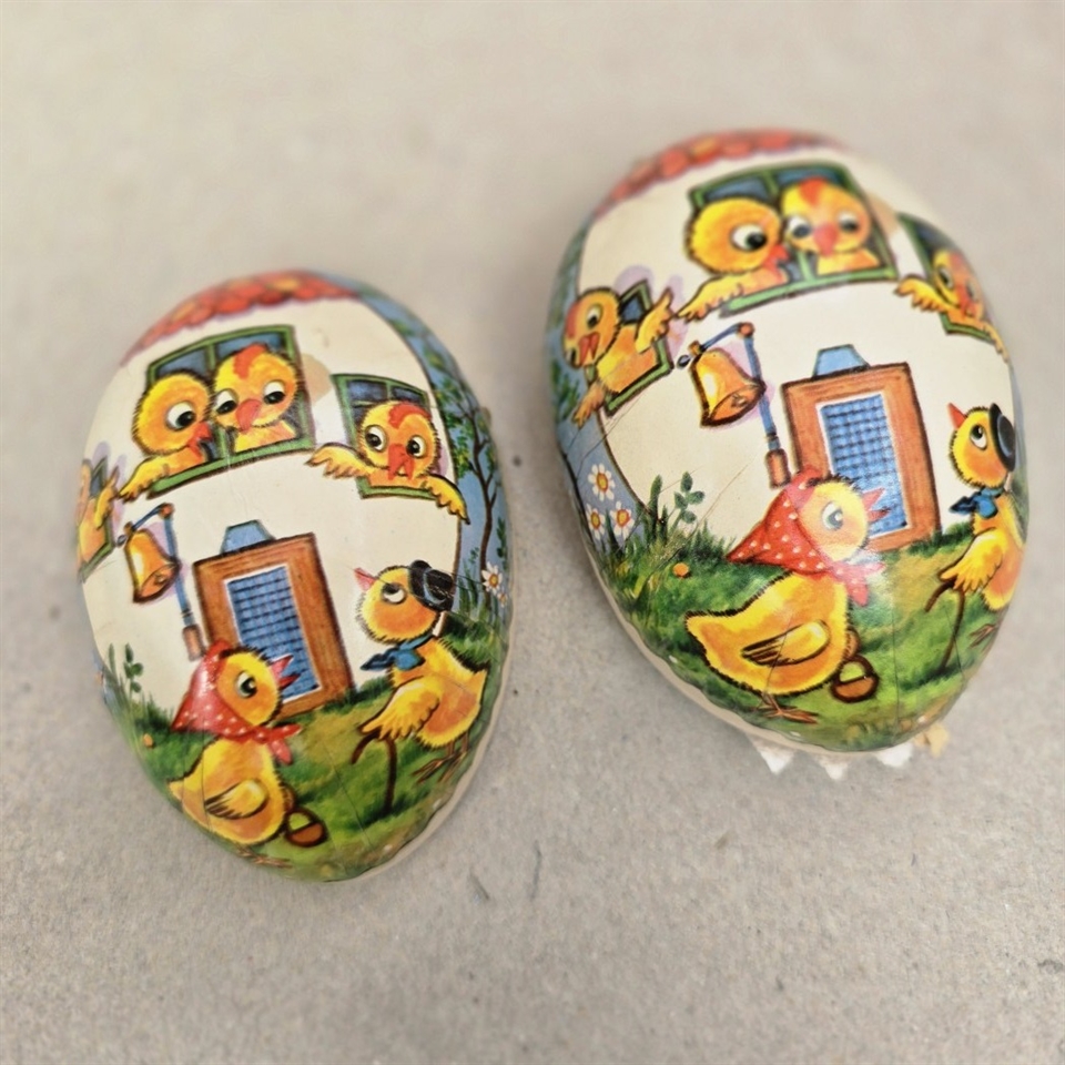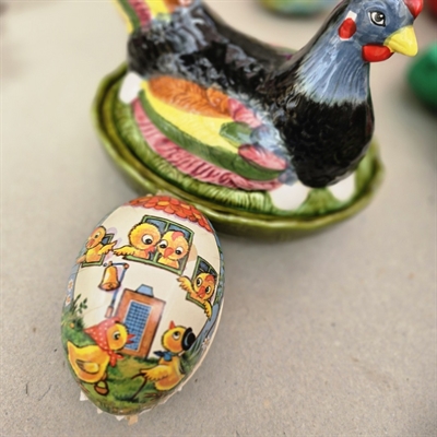 Giv din påskefejring et strejf af charme og nostalgi med dette bedårende 'Pap påskeæg, gammelt med andemor og ællinger i hus'. Dette unikke påskeæg er en sand skat fra fortiden, fremstillet i DDR (Østtysklad), og bringer en historisk elegance til din påskedekoration.