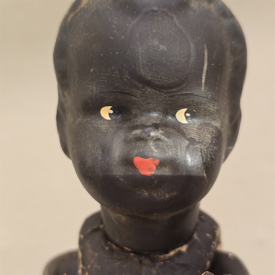 Til trods for lidt afslag på finishen, tilføjer dette blot til dens antikke charme og patina, der fortæller en historie om de mange generationer, som har elsket og leget med den. Denne dukke er perfekt som en dekorativ genstand i dit hjem, eller som en betydningsfuld gave til en samler eller nostalgisk sjæl.