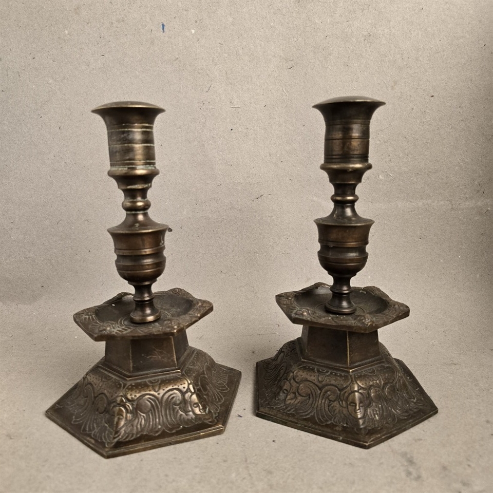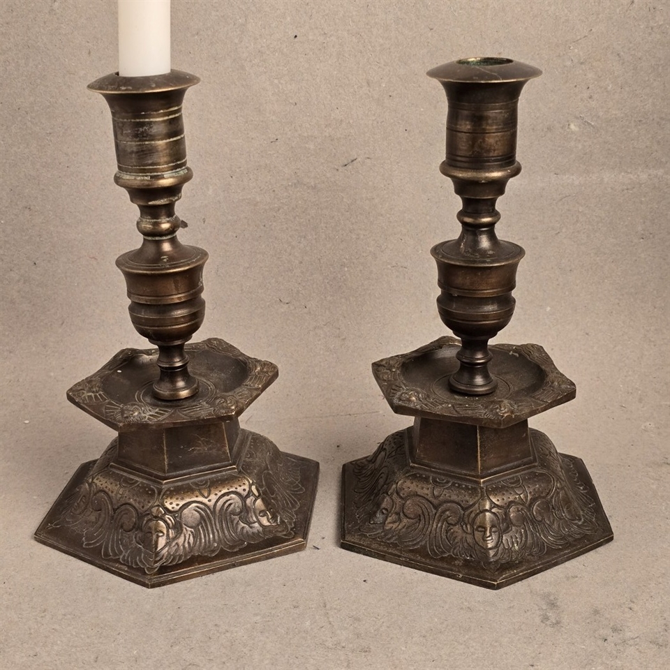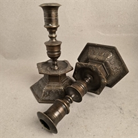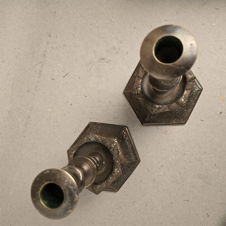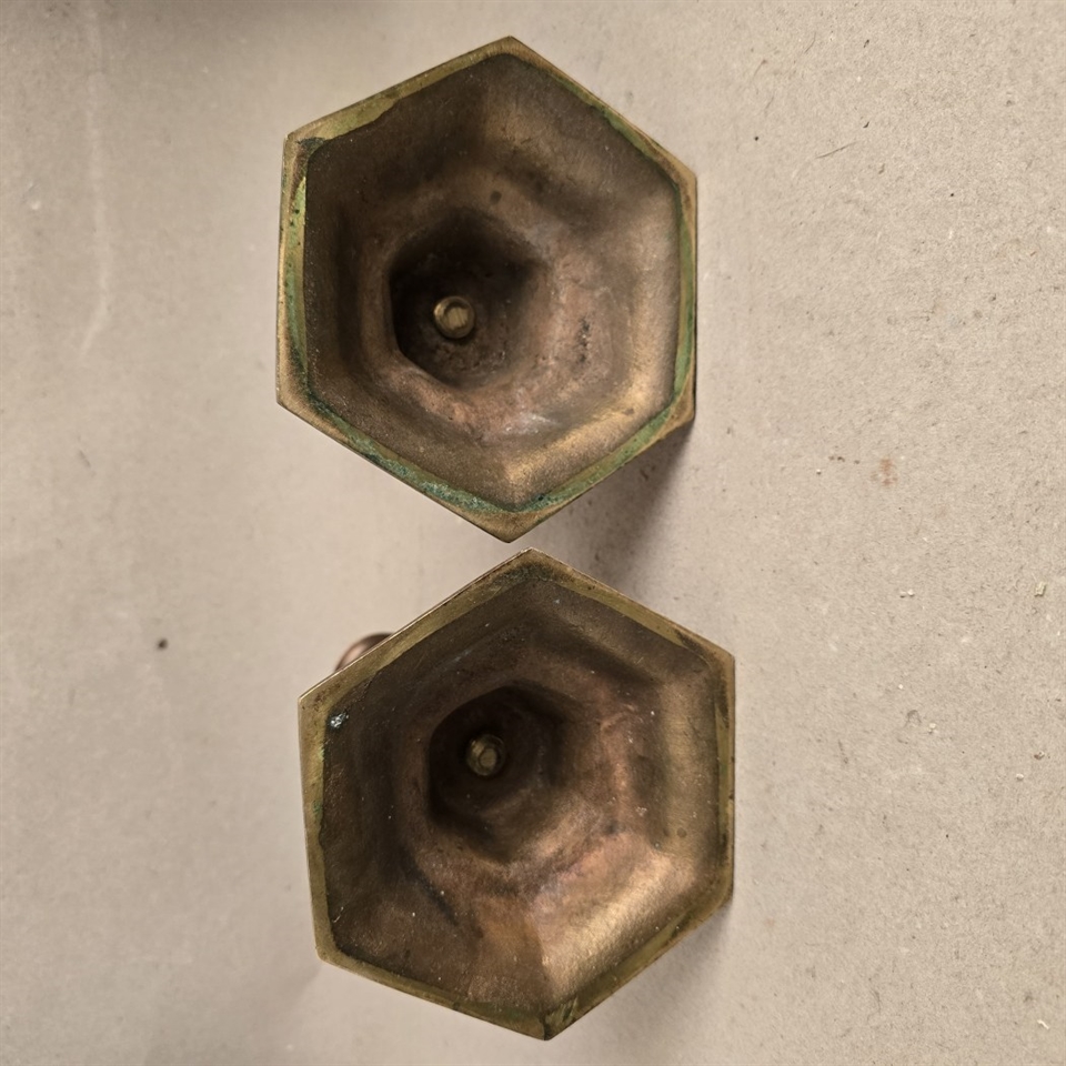 Dette par sekskantede bronze lysestager er ikke blot en belysningskilde, men et stykke historie, der tilfører en unik atmosfære til ethvert rum. Med deres tunge og robuste design, prydet med detaljerige mønsterprægninger, står disse lysestager som et vidnesbyrd om klassisk håndværk.