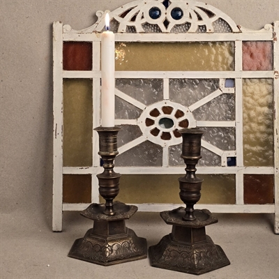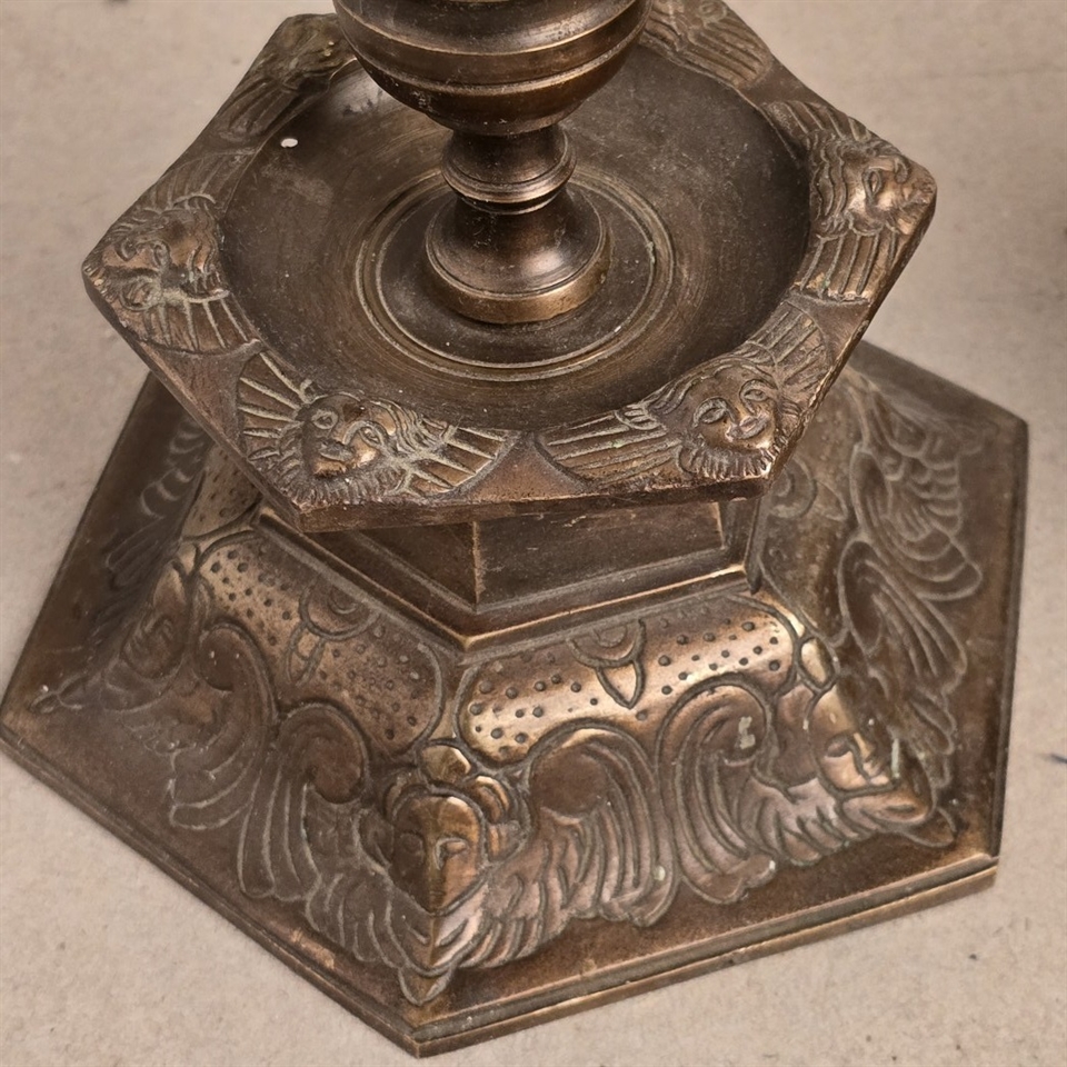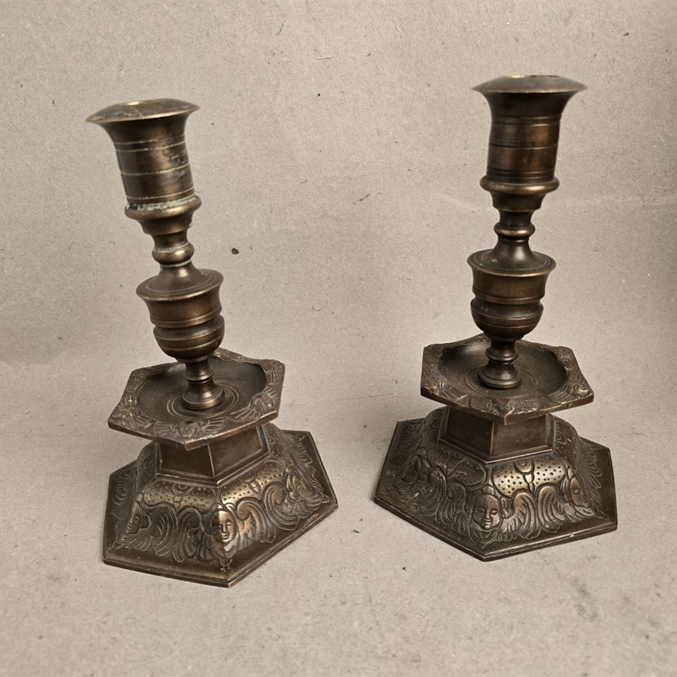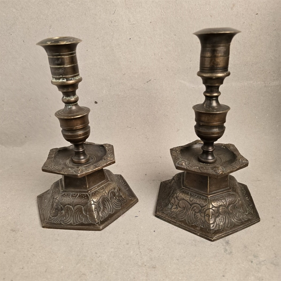 Dette par sekskantede bronze lysestager er ikke blot en belysningskilde, men et stykke historie, der tilfører en unik atmosfære til ethvert rum. Med deres tunge og robuste design, prydet med detaljerige mønsterprægninger, står disse lysestager som et vidnesbyrd om klassisk håndværk.