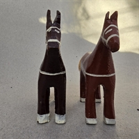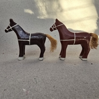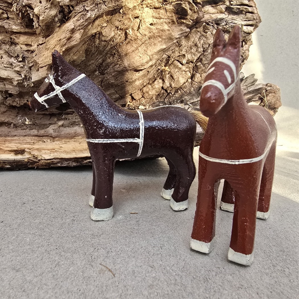 Disse smukke mørkebrune træheste med detaljeret hvidt seletøj er ikke kun legetøj, men sande kunstværker. Hver hest står 8,5 cm. høj og er perfekt til at pynte ethvert rum, hvor de tilføjer en autentisk og charmerende atmosfære.