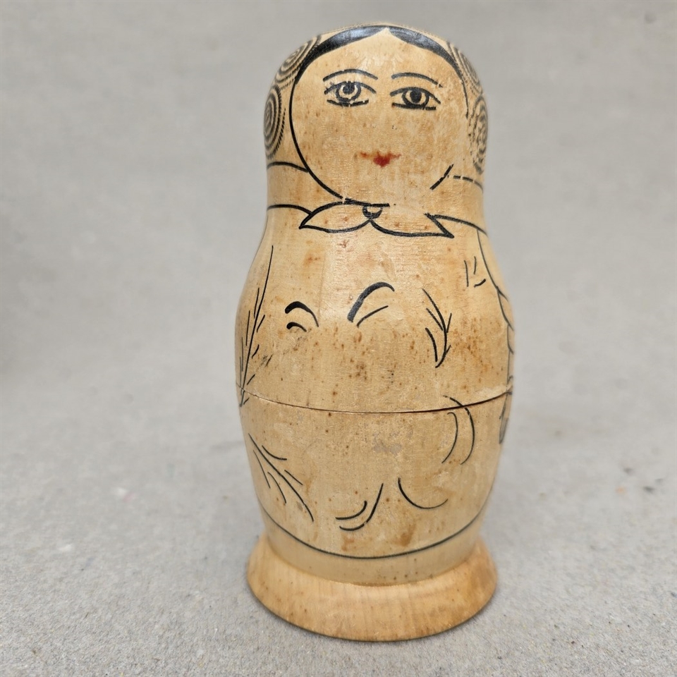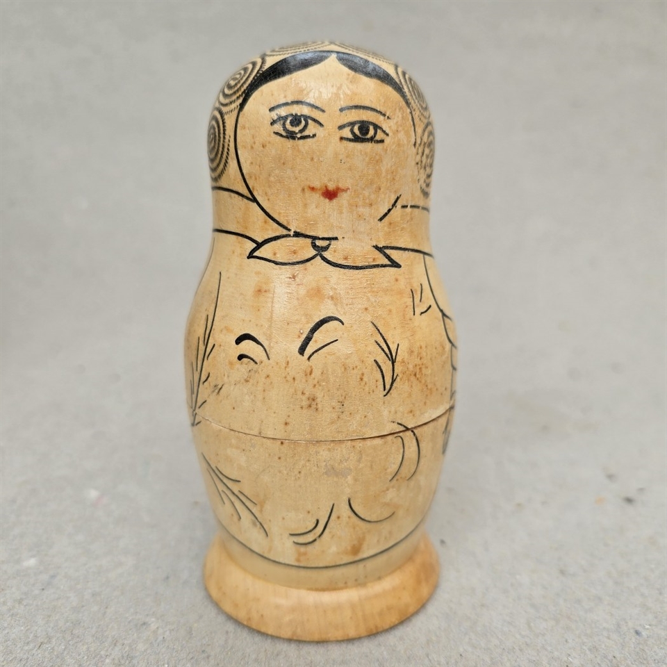 Opdag charmen ved traditionelt håndværk med denne unikke 'Patineret naturtræ babushka dukke med sorte optegninger'.
