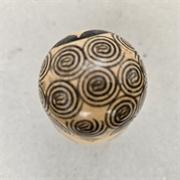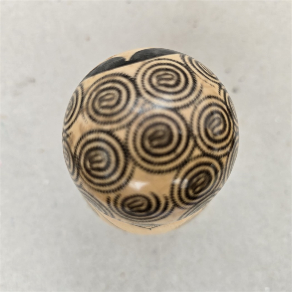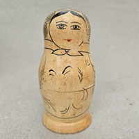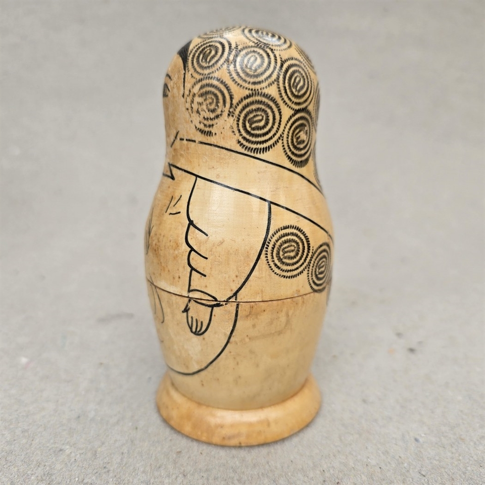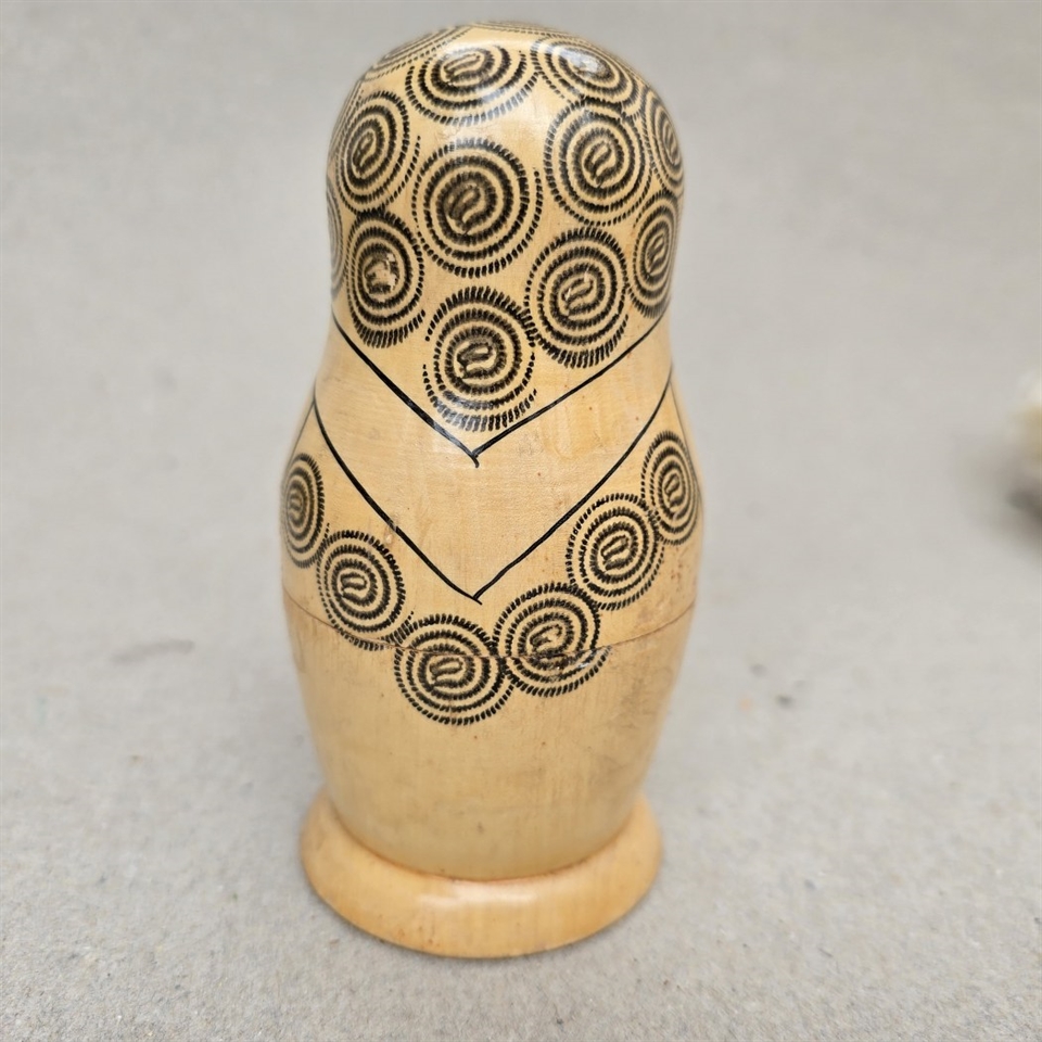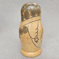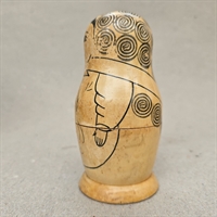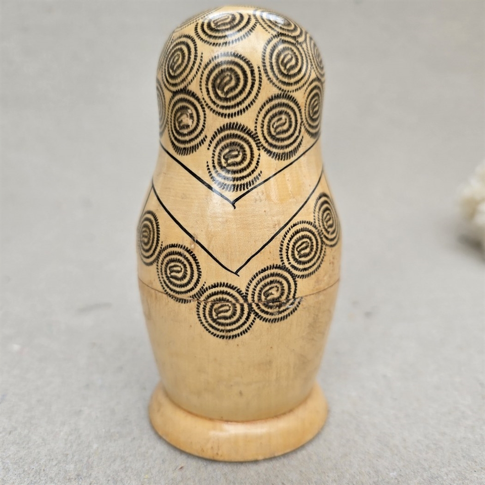 Denne klassiske russiske babushka dukke, også kendt som en matrjosjka, er fremstillet af naturligt træ og prydet med håndtegnede sorte mønstre, der fremhæver dens fine detaljer og håndværksmæssige kvalitet.