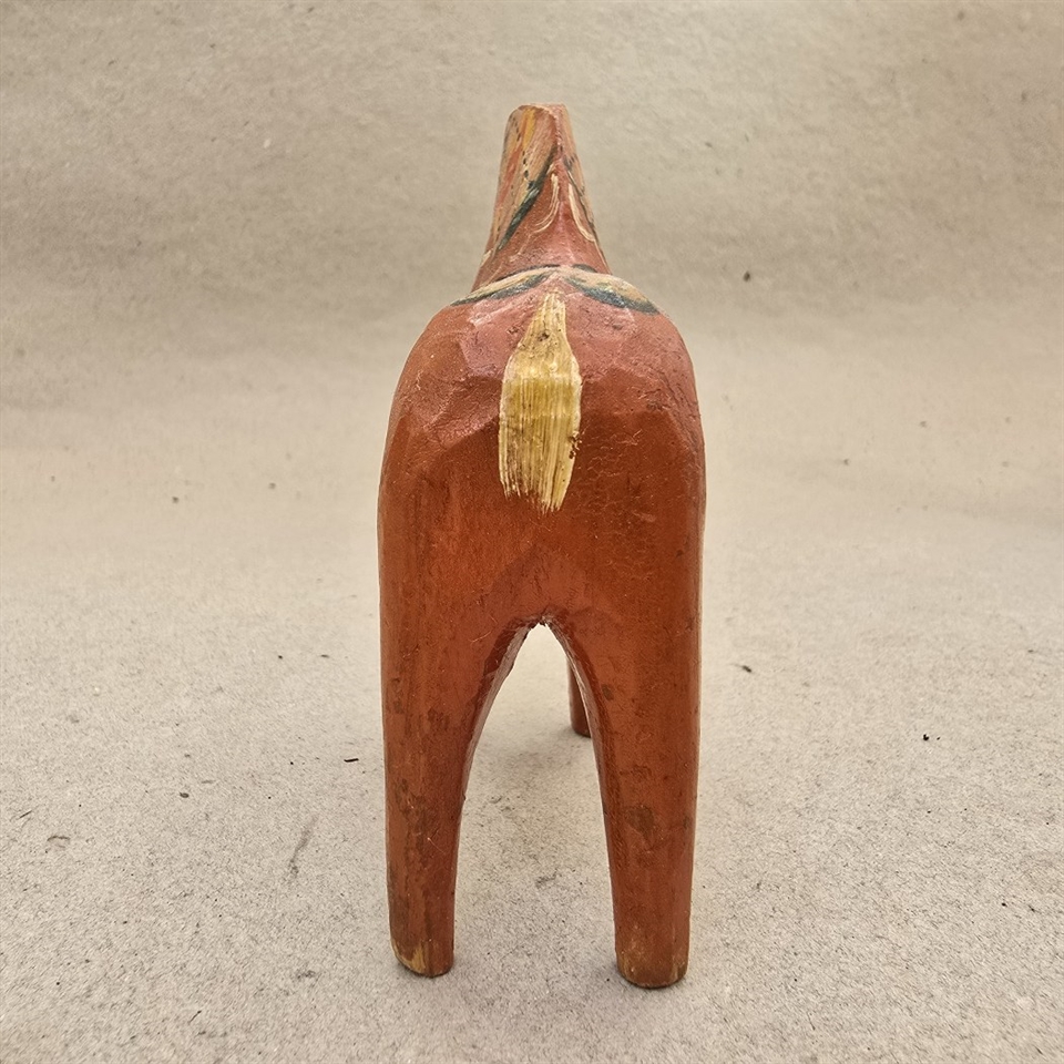 Denne klassiske svenske Dalarhest, kendt for sin dybe historie og betydning i svensk folklore, er fremstillet af træ og omhyggeligt håndmalet i en varm orangerød farve smukt patineret, der tilføjer karakter og historisk æstetik.