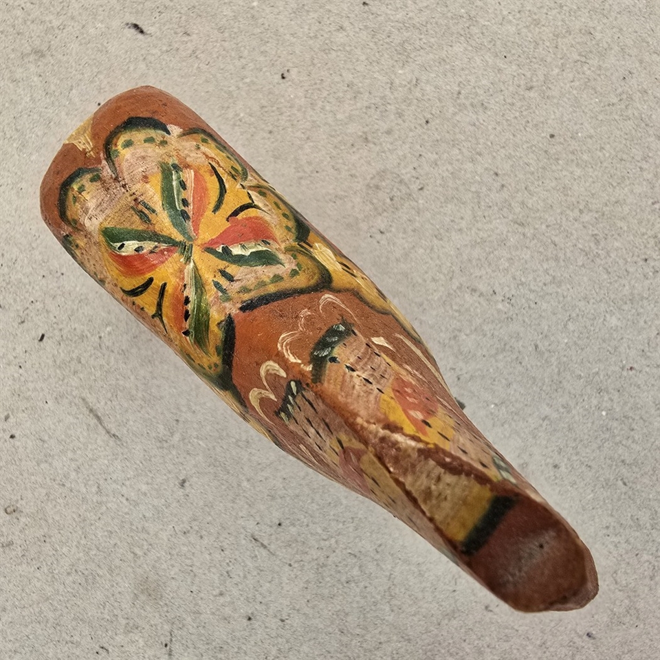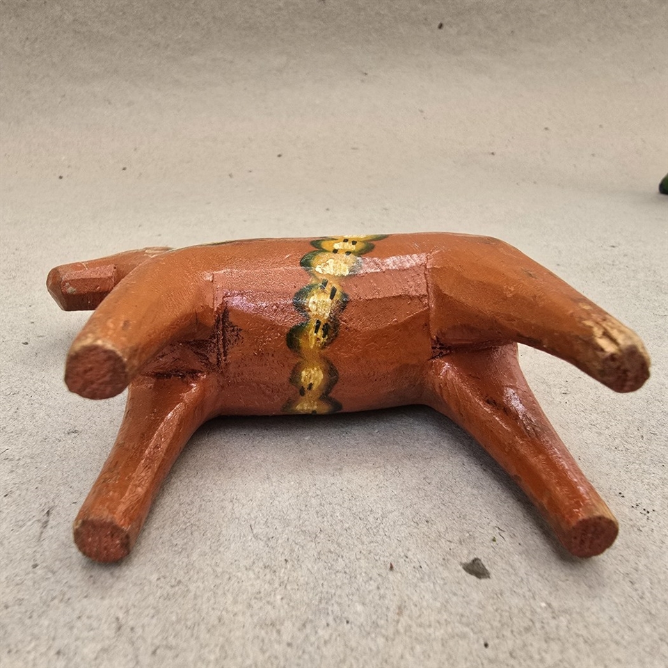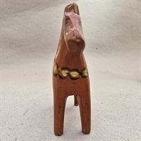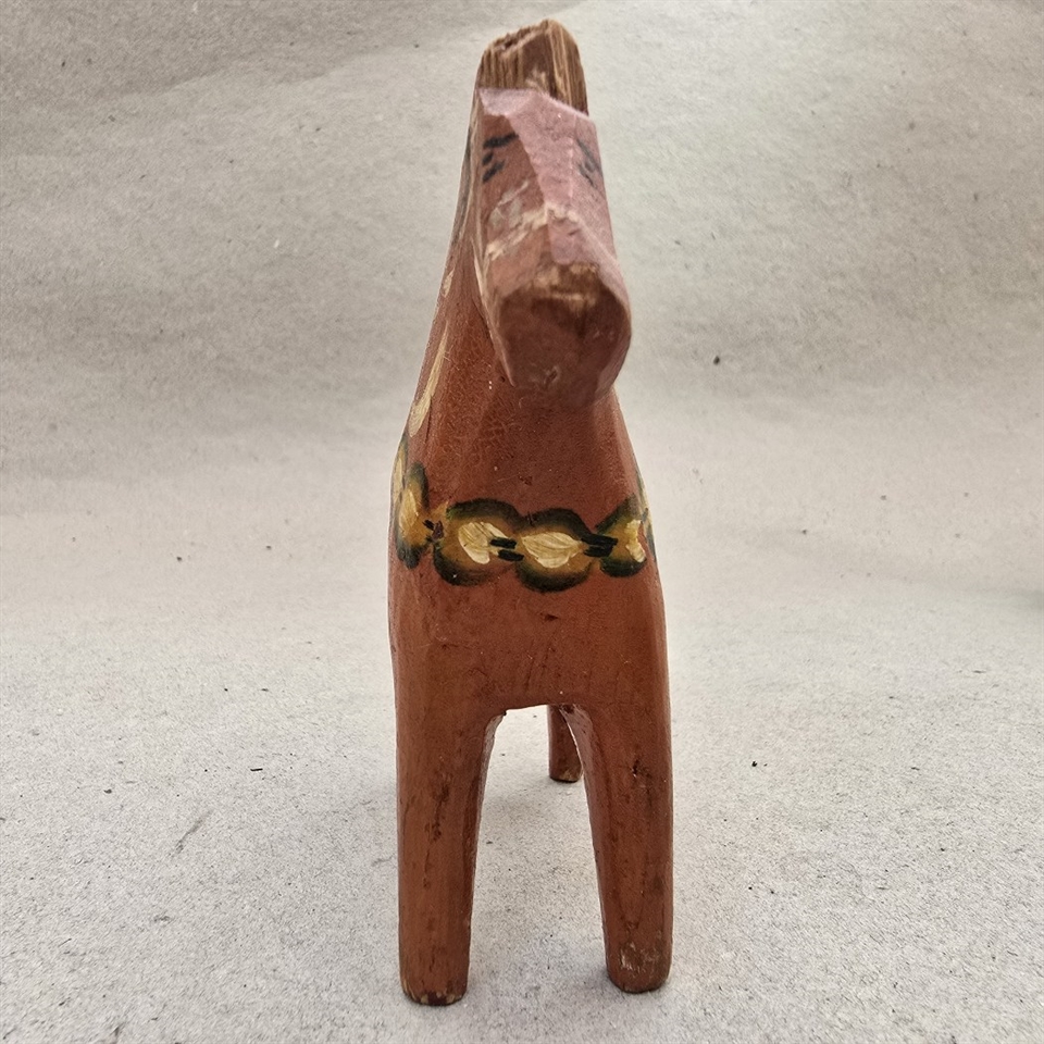 Til trods for sine slidte ører, som tilføjer en autentisk antik charme, står denne Dalarhest stolt med en højde på 9,7 cm., perfekt som en iøjnefaldende dekoration på enhver hylde, skrivebord eller som en del af et samlingsobjekt.