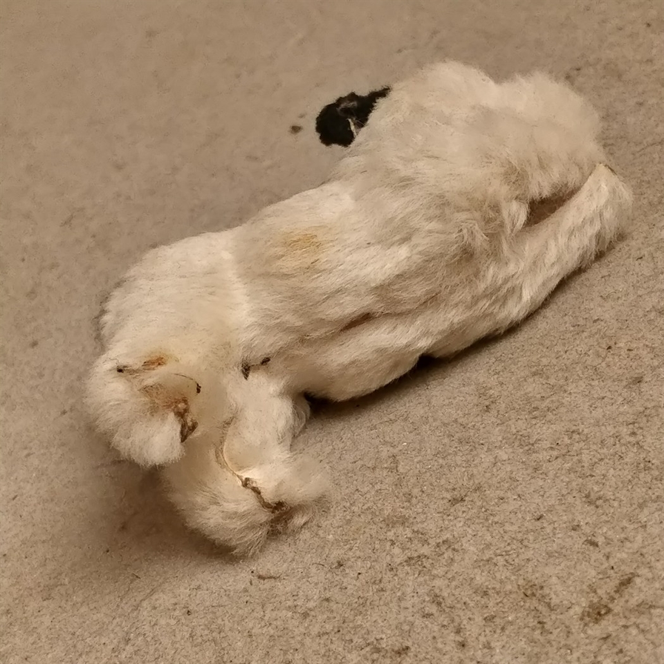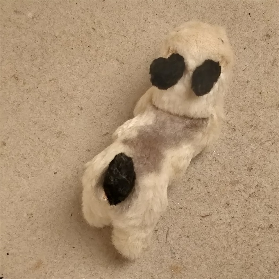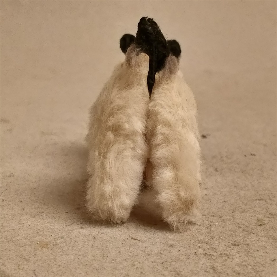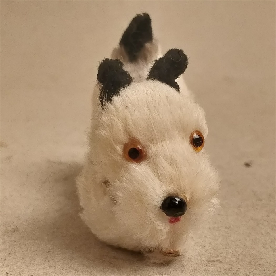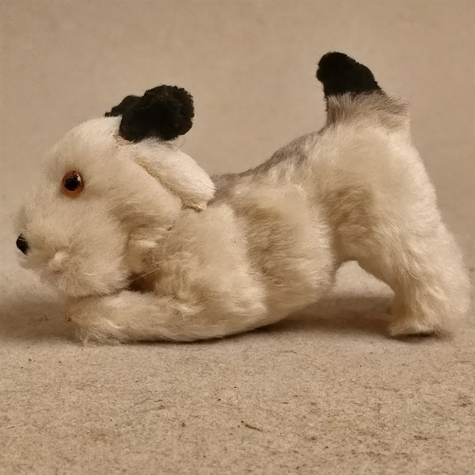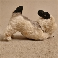 Opdag charmen i vintage med denne bedårende 'Pelshund ned på forbenene, sort hvid'! Denne nostalgiske legetøjshund bringer et strejf af fortidens glæde og enkelthed til din samling. Med sit karakteristiske sort-hvide mønster, inklusive sorte ører og hale, er denne lille hund en ægte klassiker.