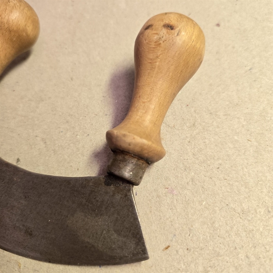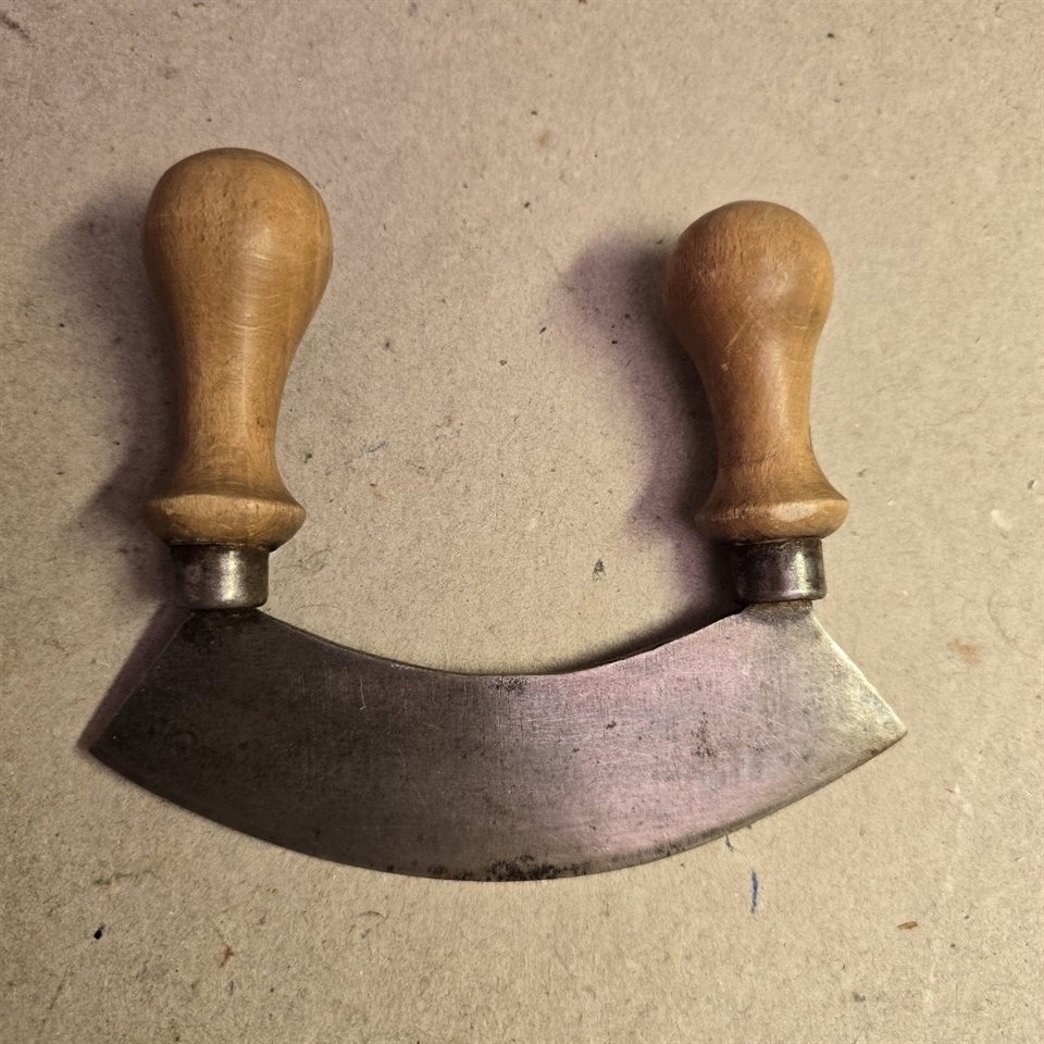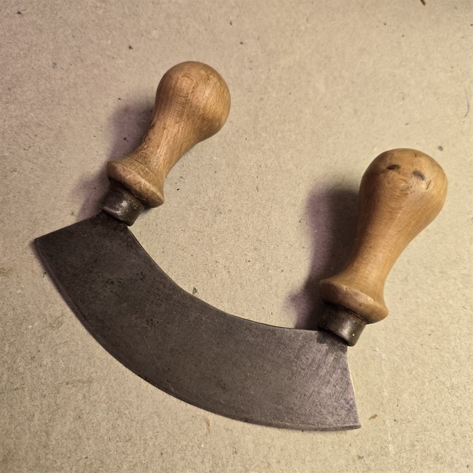 Denne persillehakker er ikke kun praktisk til hakning af persille, men også ideel til andre krydderurter, hvilket gør den til en alsidig tilføjelse til dit køkkenarsenal. Det håndskårne træhåndtag sikrer et sikkert og komfortabelt greb, mens det skarpe metalblad gør hakkearbejdet til en leg.