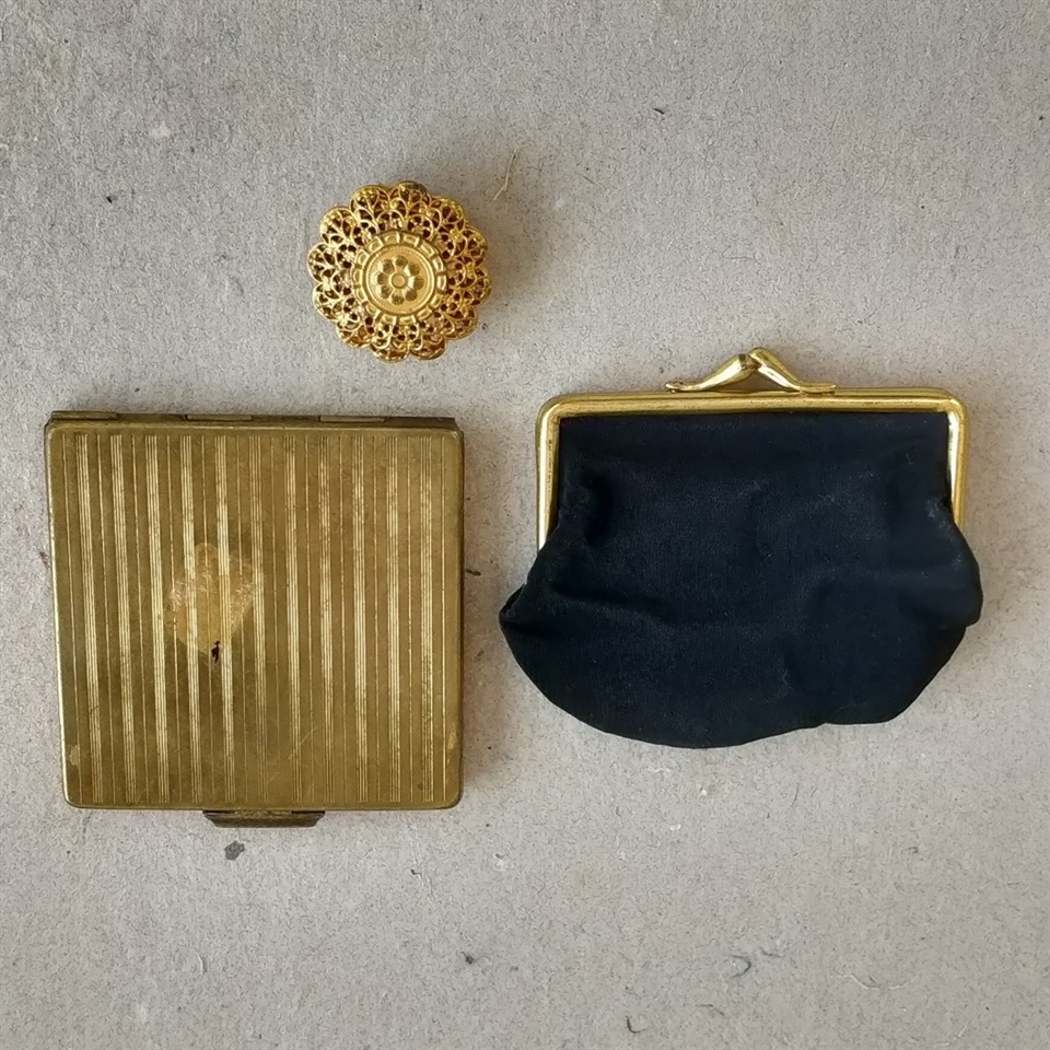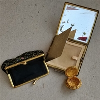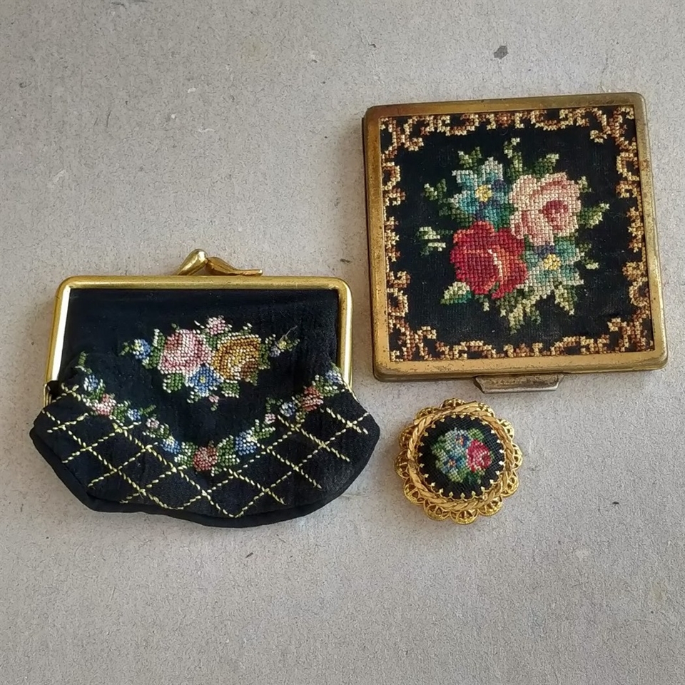 Opdag skønheden og elegancen i dette vintage tilbehørssæt, der består af en petit point dekoreret pilleæske, pung og en firkantet pudderdåse med spejl.