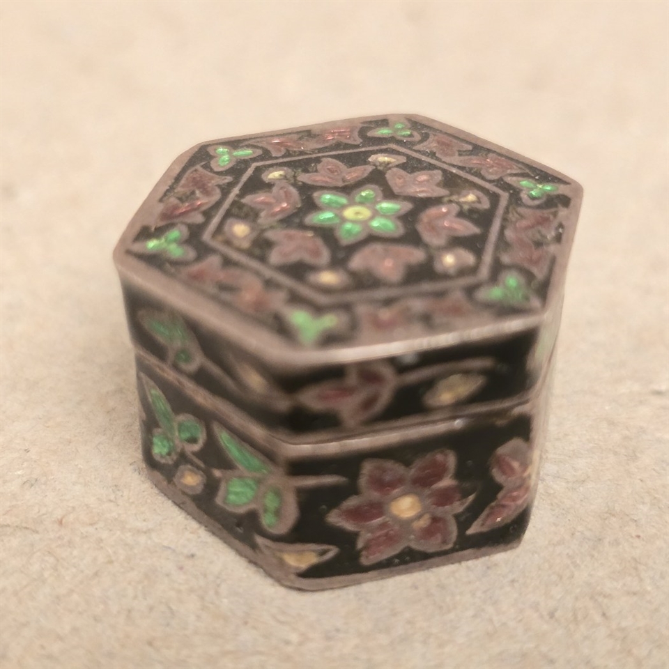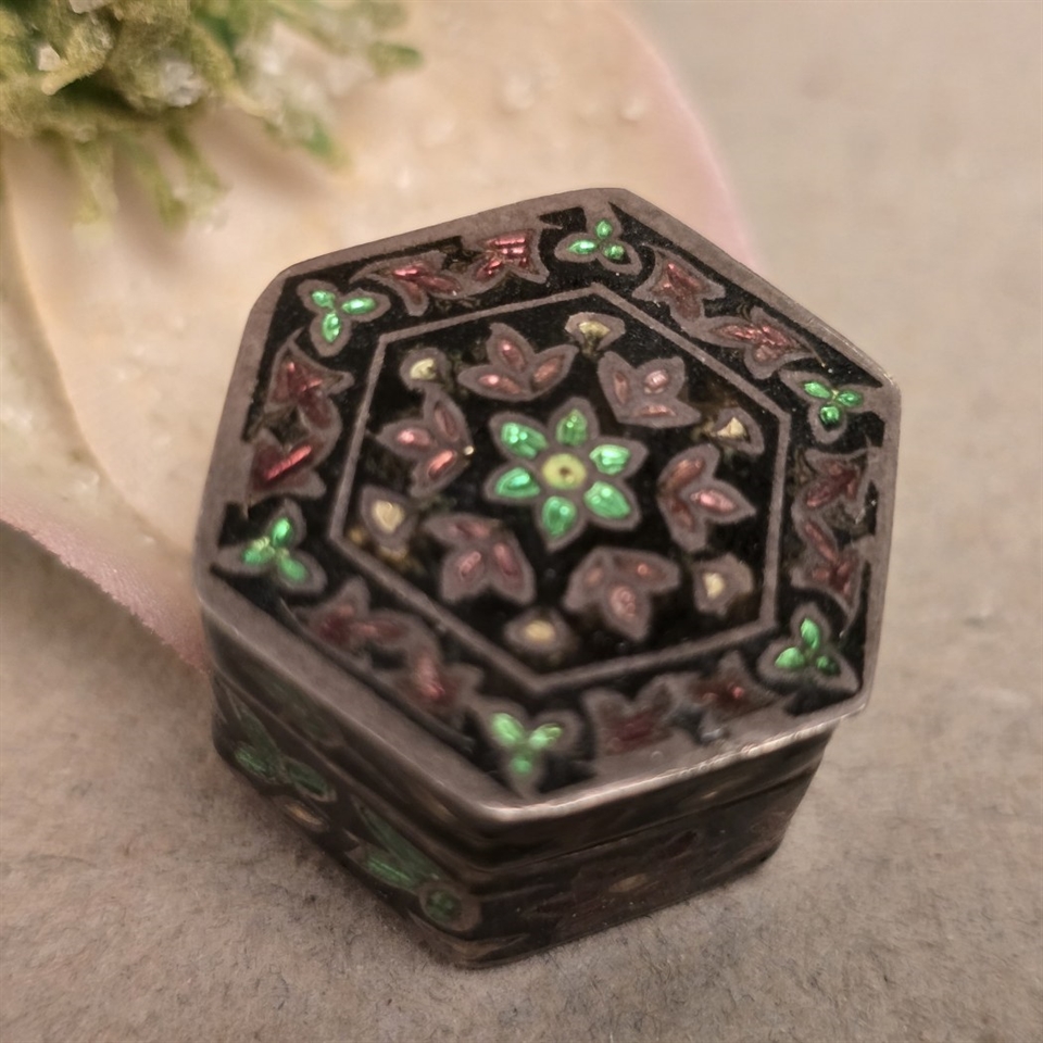 Opdag charmen og elegancen af fortiden med vores 'Pilleæske sekskantet cloisonné sølvæske, gammel'.