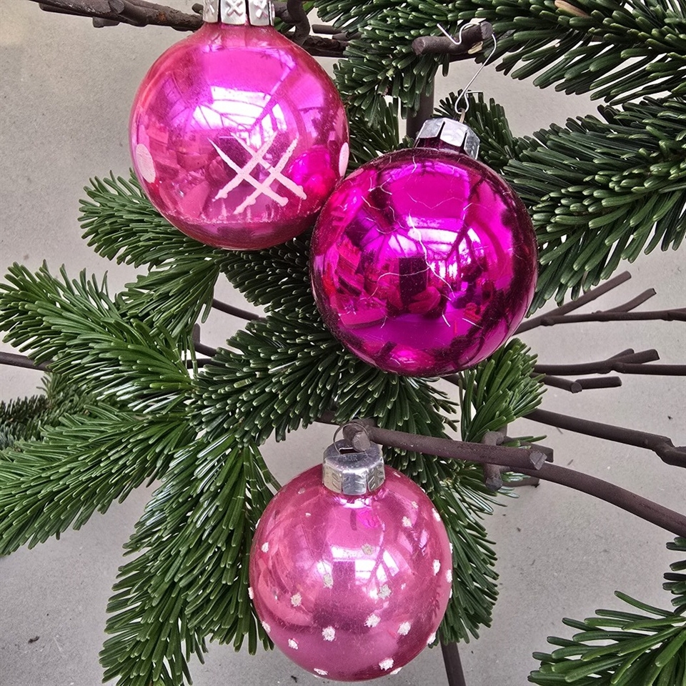 Opgrader dit juletræ med et strejf af nostalgi med vores charmerende sæt af tre 'Pink gamle juletræs glaskugler'.