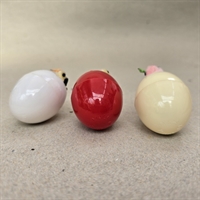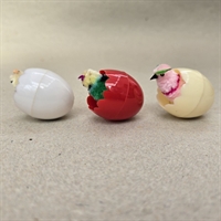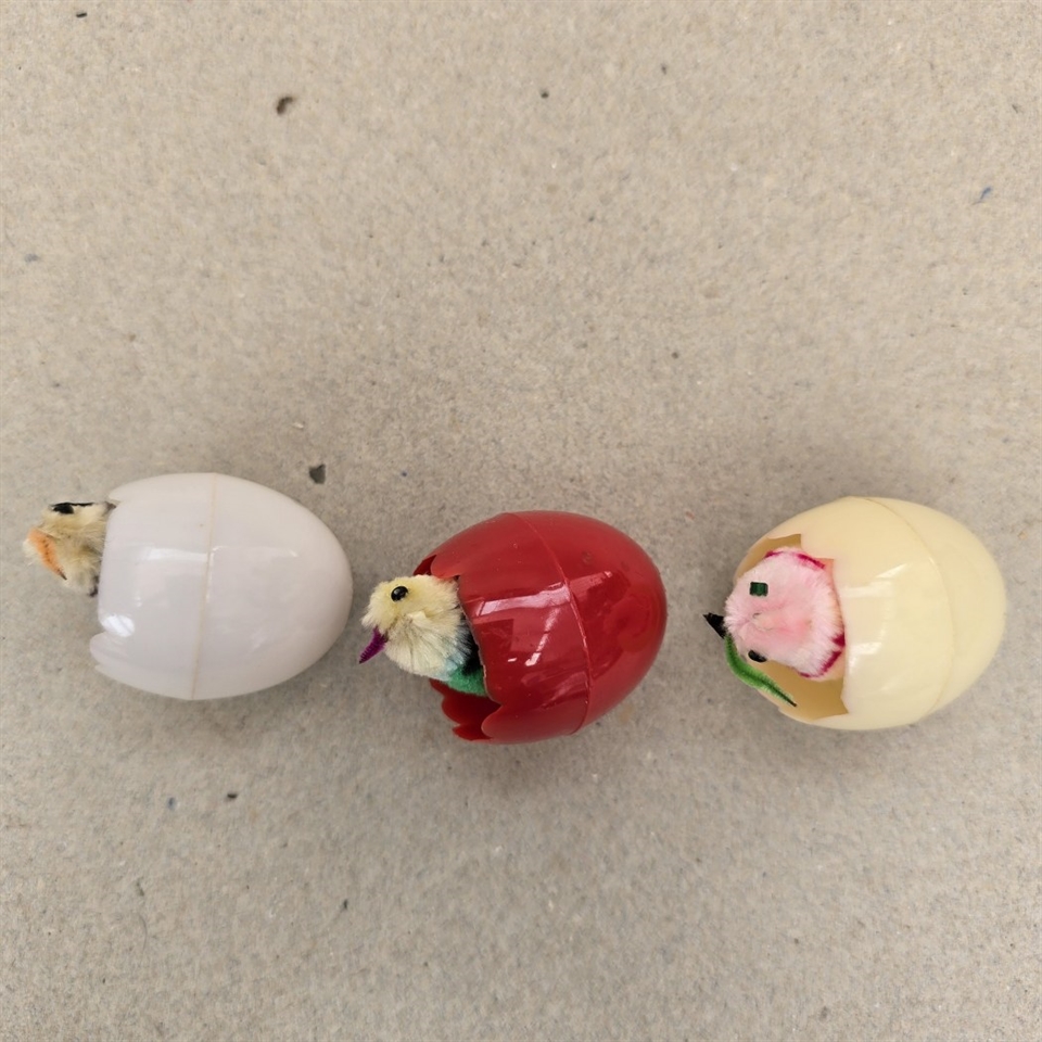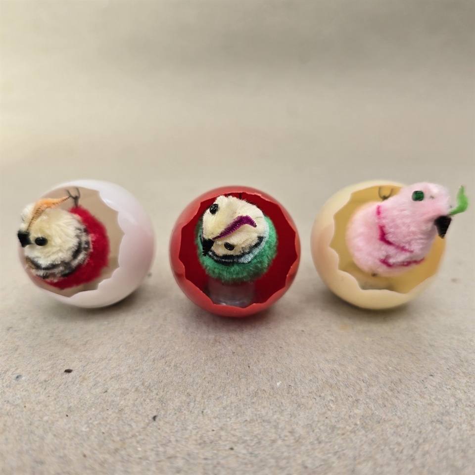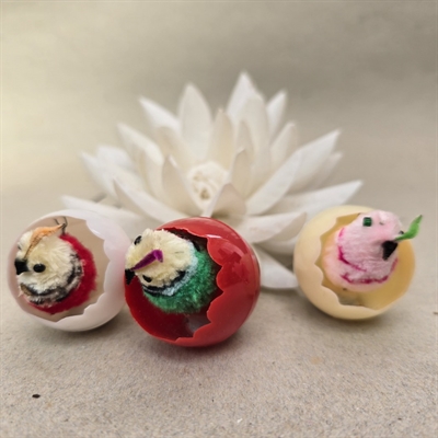Dette sæt består af tre farverige æggeskaller i rød, offwhite og hvid, hver især hjem for en sød chenillekylling, der gynger muntert, når ægget røres.