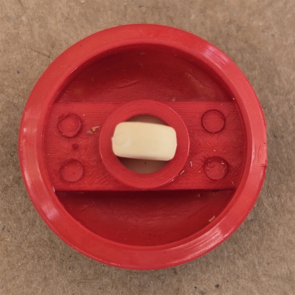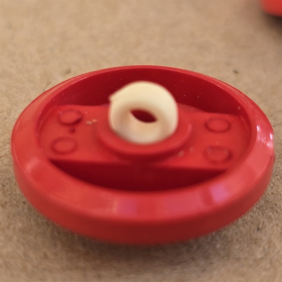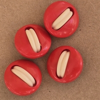 Hver knap måler 22 mm. i diameter og fremstår med en iøjnefaldende rød farve, prydet med elegante hvide striber i midten.