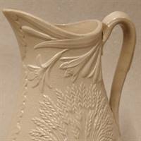 Hanley kande, i cremefarvet glasur, med relief dekorationer.