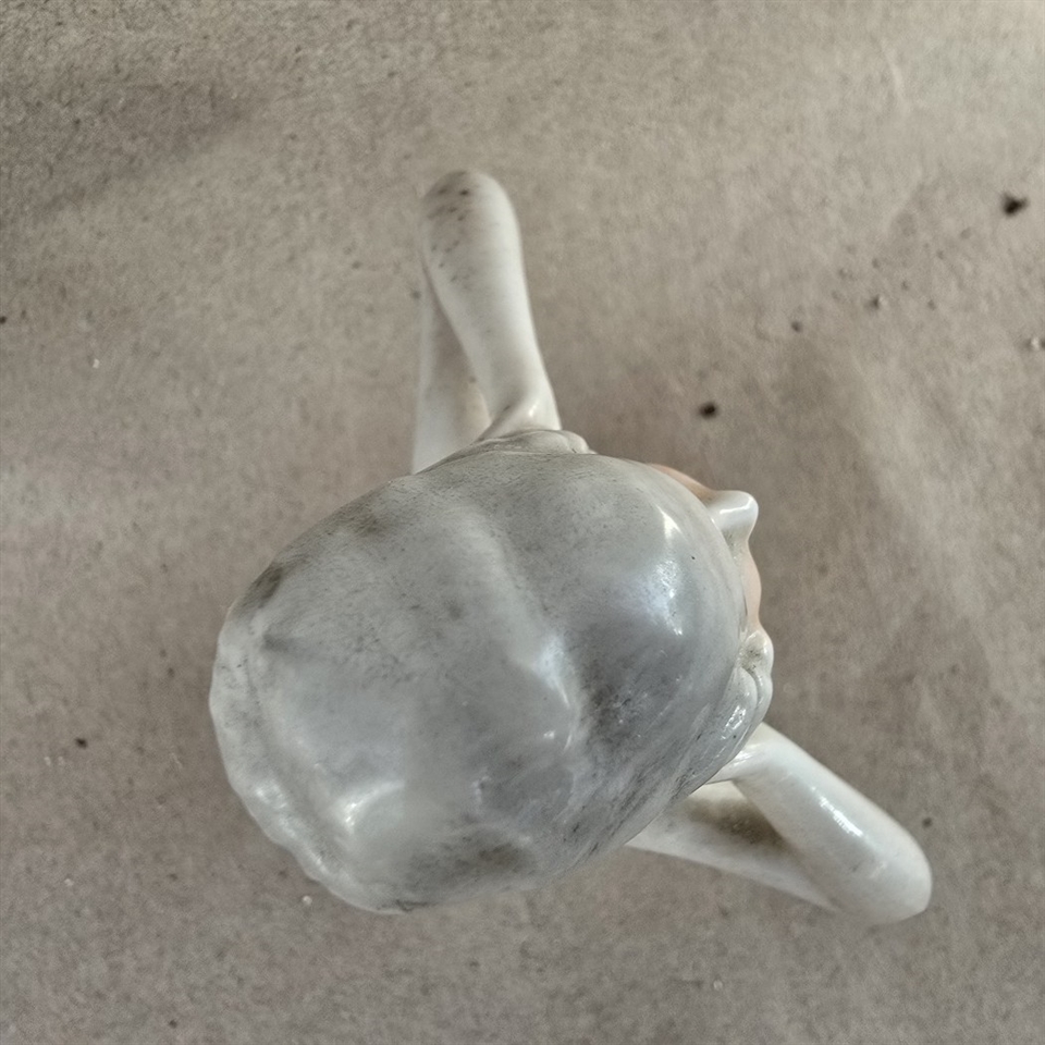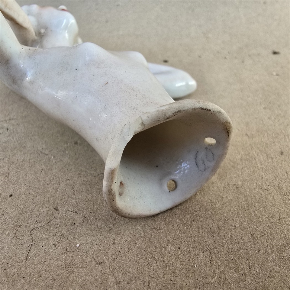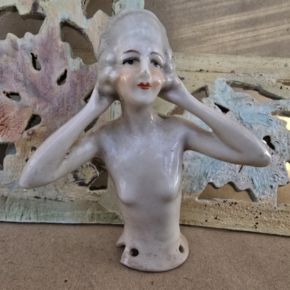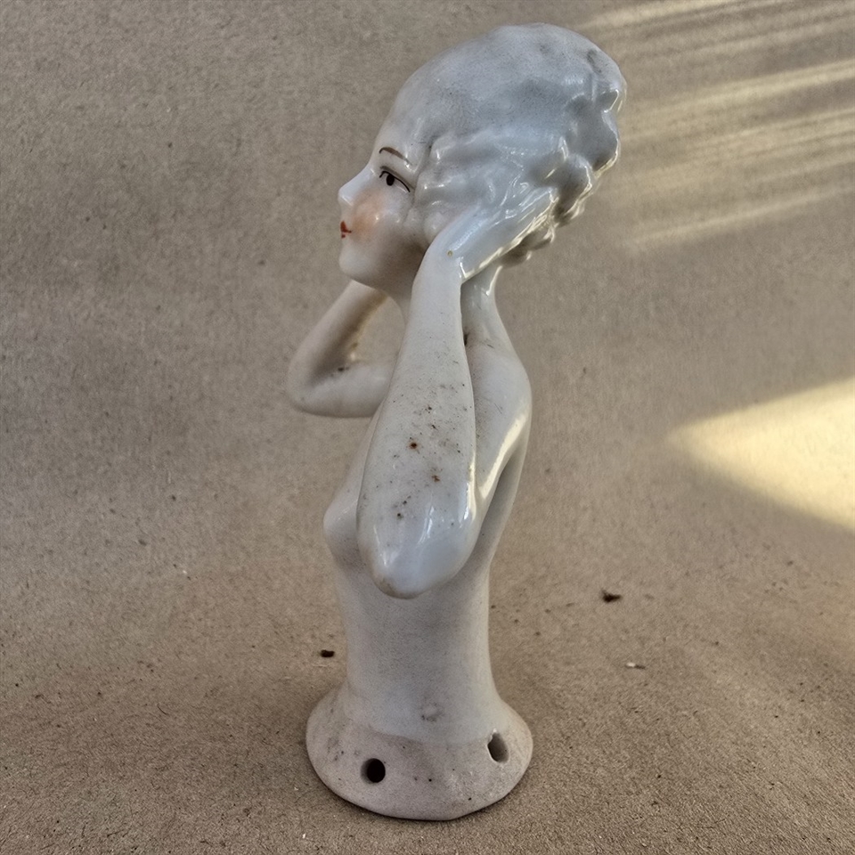 Til trods for et lille skår i underkanten, som vidner om dens alder og historie, bevarer denne halvdukke sin charme og æstetiske værdi.
